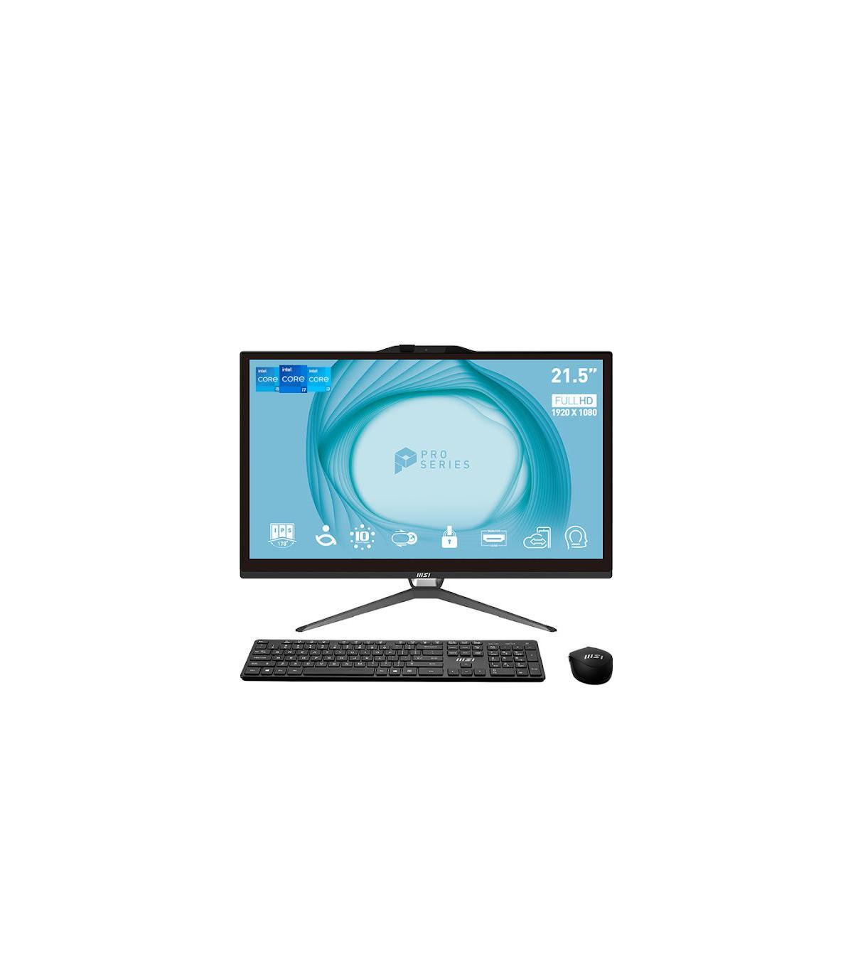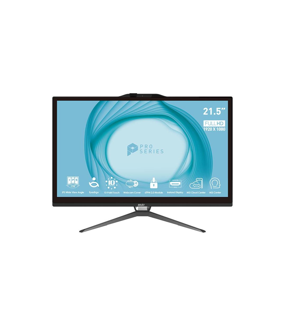 MSI Pro AP222T 13M-217ES. Tipo de producto: PC todo en uno. Diagonal de la pantalla: 54,6 cm (21.5"), Tipo HD: Full HD, Resolución de la pantalla: 1920 x 1080 Pixeles, Pantalla táctil, Tipo de pantalla: IPS. Familia de procesador: Intel® Pentium® Gold. Memoria interna: 4 GB, Tipo de memoria interna: DDR4-SDRAM. Capacidad total de almacenaje: 128 GB, Unidad de almacenamiento: SSD. Modelo de adaptador gráfico incorporado: Intel UHD Graphics 710. Cámara incorporada. Sistema operativo instalado: Windows 11 Pro. Color del producto: Negro