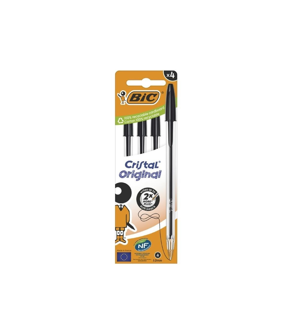 Estos bolgrafos Bic Cristal cuentan con un resistente mecanismo de carburo de tungsteno y tinta suave de secado instantneo para un uso diario fiable. La punta mediana de 1,0 mm produce un trazo fino de 0,32 mm. El cuerpo hexagonal incluye un capuchn y un tapn negros a juego con el color de la tinta para facilitar su identificacin. Este paquete contiene 4 bolgrafos negros en una caja de cartn reciclable.