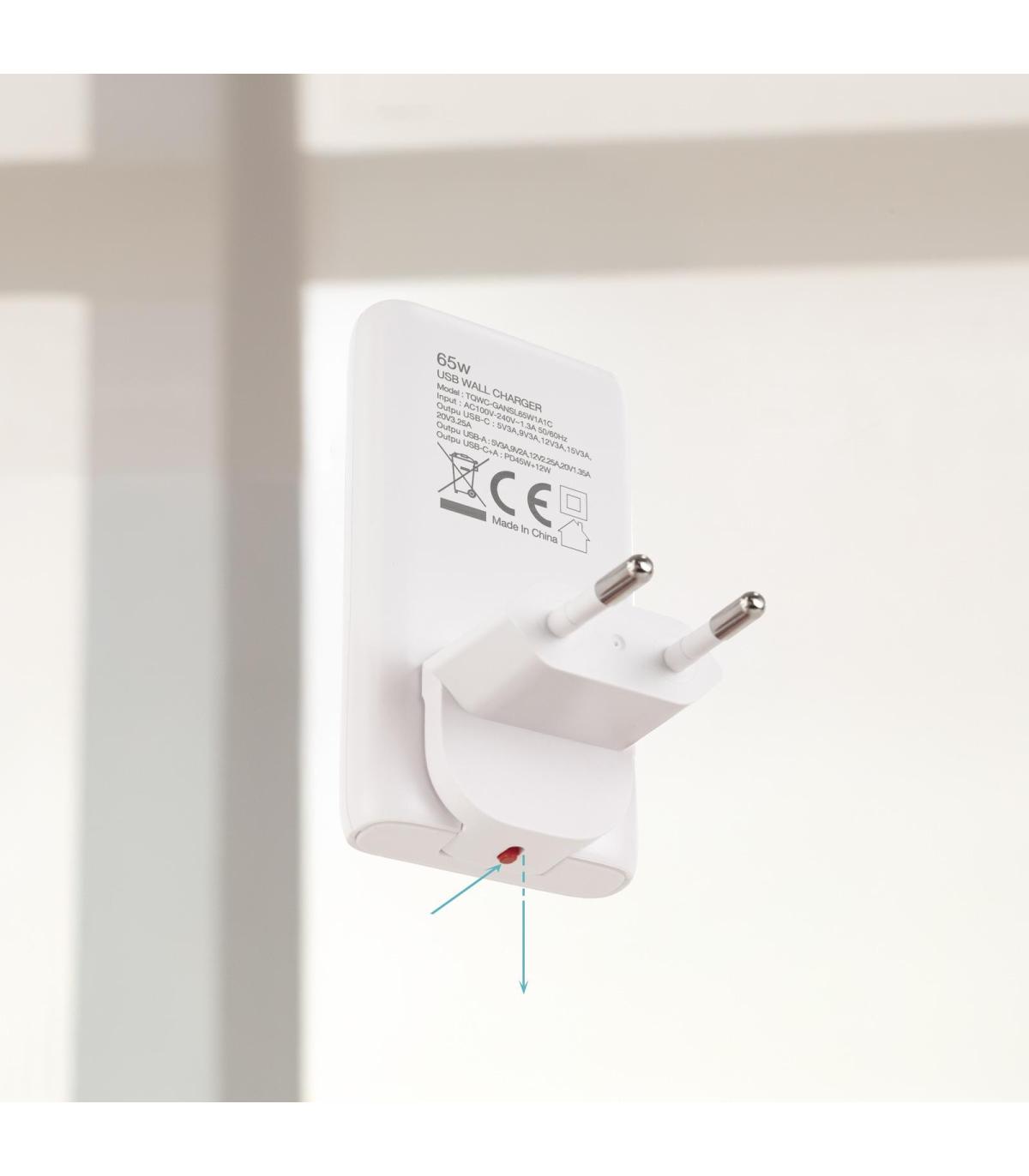 Cargador de viaje Tipo C, E y F (Europeo) y Tipo A (Amerciano/asiático). Tecnología GaN 65W con puertos USB-C/PD y USB-A/QC. Diseño ultrafino para que lo puedas llevar de viaje, adaptativo a enchufes Tipo A con tan solo deslizar el cabezal pulsando la pestaña roja.