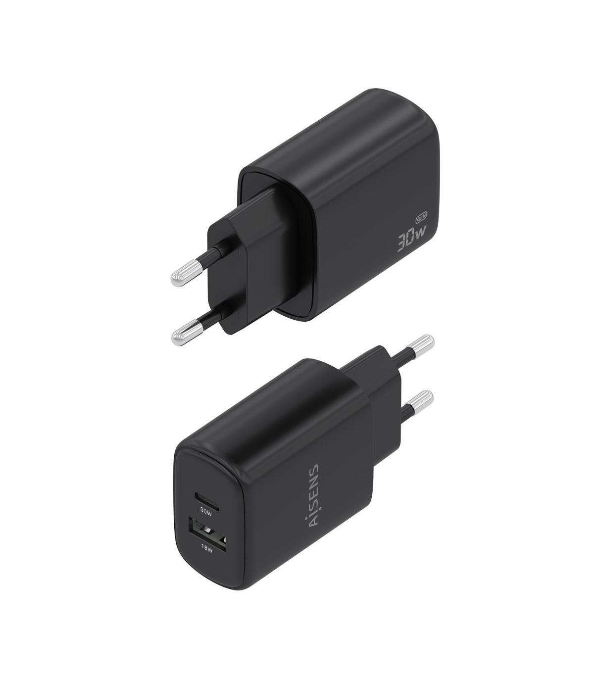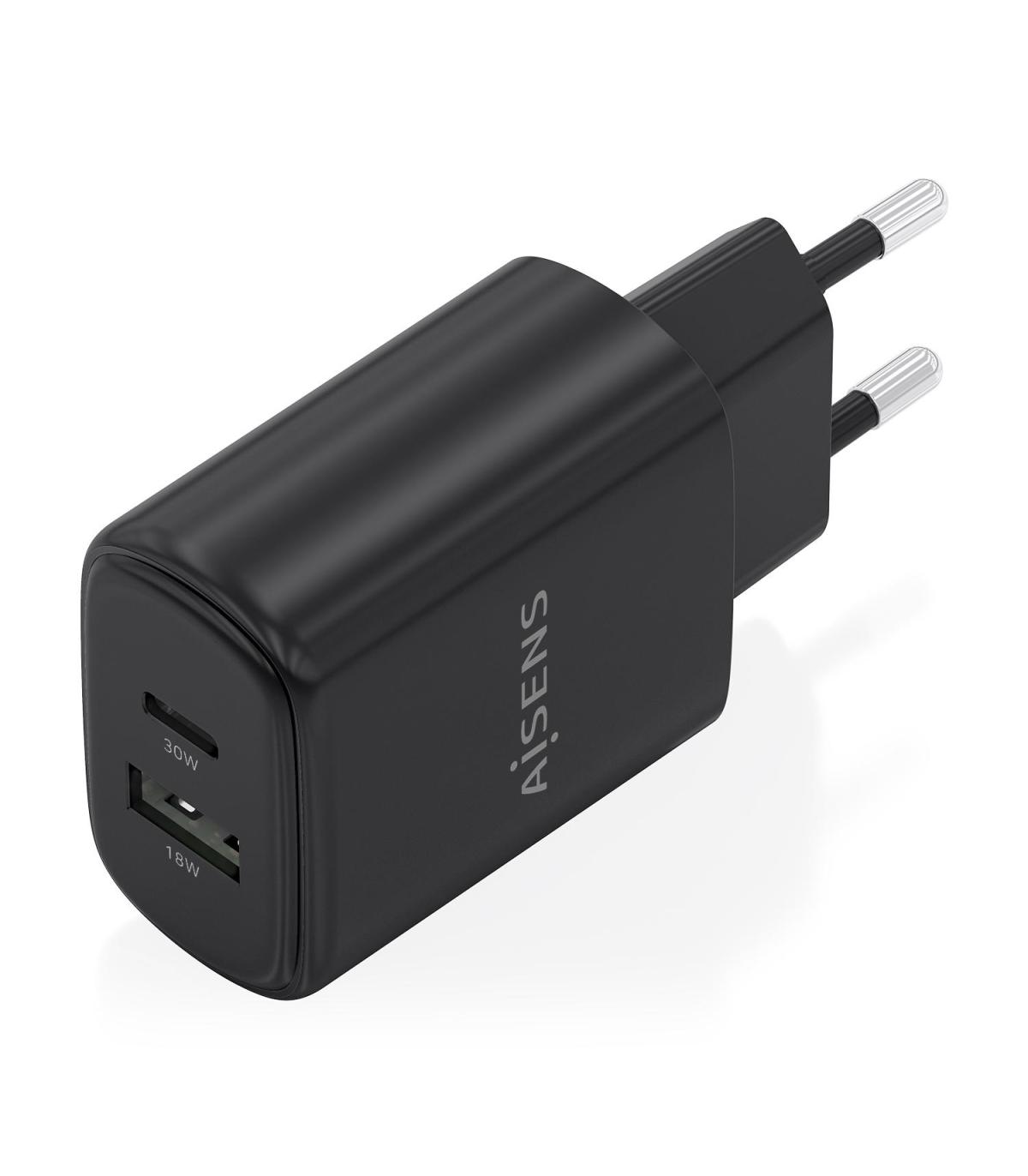 AISENS Cargador GaN 30W, 1xUSB-C PD3.0 QC4.0, 1xUSB-A QC3.0, Negro. Tipo de cargador: Interior, Alimentación: Corriente alterna, Compatibilidad del cargador: Cámara digital, Teléfono móvil, Portátil, Smartphone, Tableta, Universal. Voltaje de entrada: 100-240 V, Voltaje de salida máximo: 20 V. Número de puertos USB Tipo C: 1, Carga rápida, Funciones de protección de poder: Sobrecarga, Cortocircuito. Color del producto: Negro
