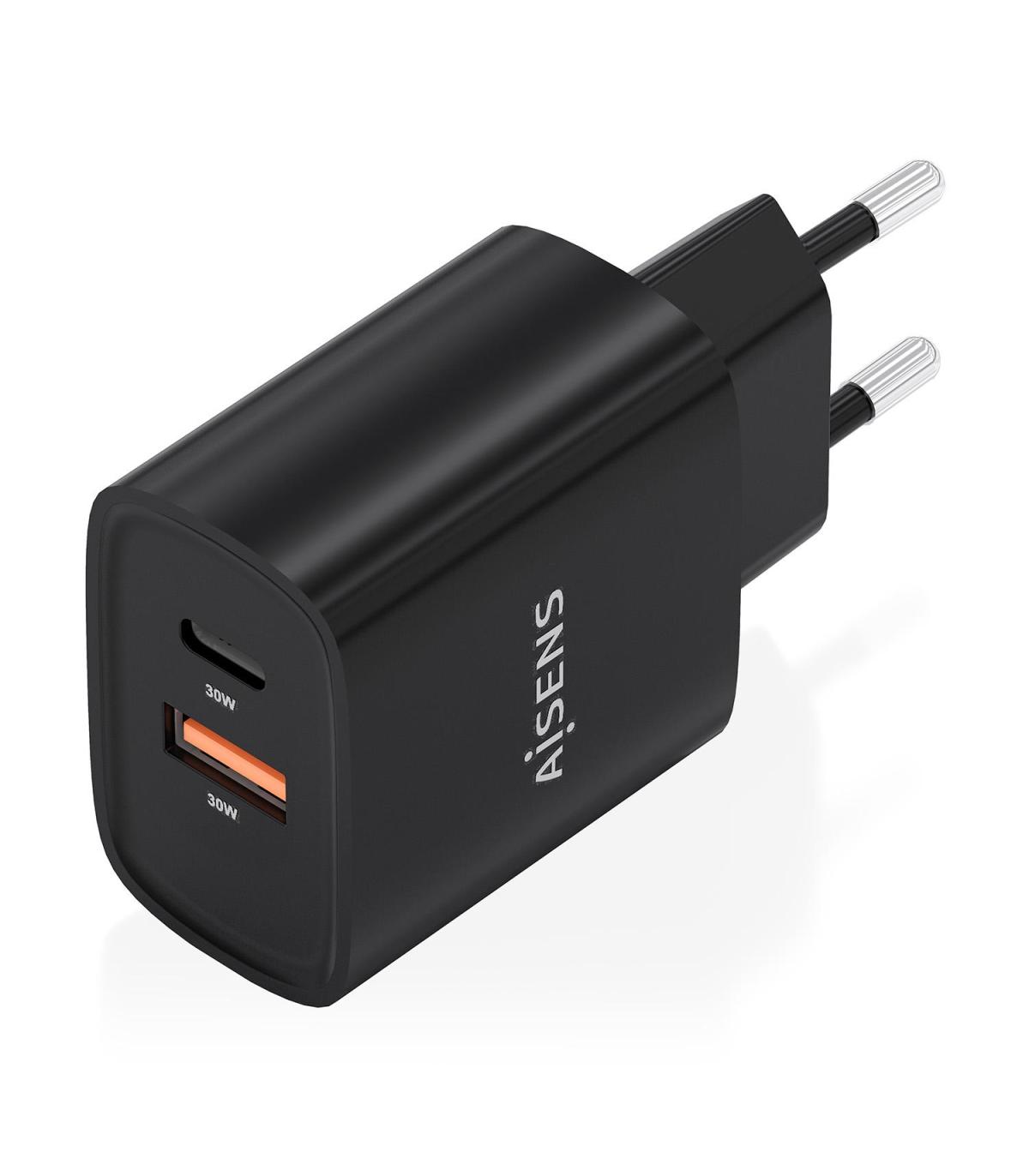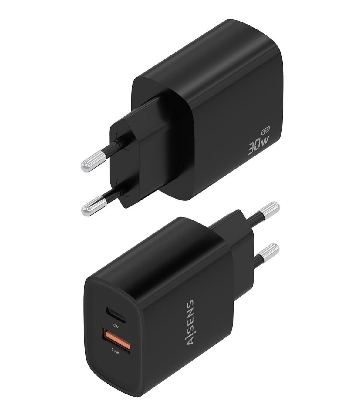 AISENS Cargador GaN 30W, 1xUSB-C PD3.0 QC4.0, 1xUSB-A QC3.0, Negro. Tipo de cargador: Interior, Alimentación: Corriente alterna, Compatibilidad del cargador: Universal. Voltaje de entrada: 100 - 240 V, Voltaje de salida máximo: 12 V, Corriente de salida de adaptador AC: 3 A. Cantidad de puertos USB 2.0: 1, Número de puertos USB Tipo C: 1, Carga rápida, Funciones de protección de poder: Sobrecarga, Cortocircuito. Color del producto: Negro