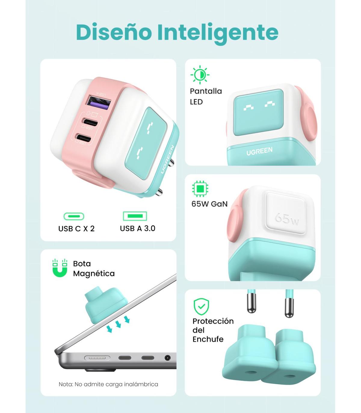 Ugreen Uno RG 65W 3-Port GaN Fast Charger pink blue. Tipo de cargador: Interior, Alimentación: Corriente alterna, Compatibilidad del cargador: Ordenador portátil, Teléfono móvil, Portátil, Tableta, Teléfono, Carga rápida. Color del producto: Azul