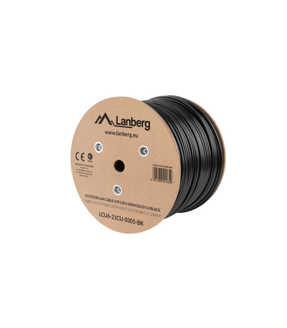 BOBINA CABLE RED LANBERG EXTERIOR UTP RJ45 CAT.6 SOLIDO CU AWG24 305M NEGRO FLU