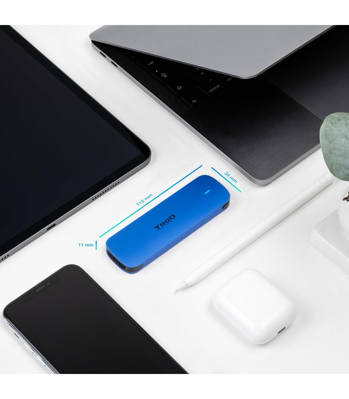 TooQ Caja externa para SSD M.2 NVMe, Azul. Tipo de producto: Caja externa para unidad de estado sólido (SSD). Número de unidades de almacenamiento compatibles: 1, Tamaño de la unidad de almacenamiento: M.2, Interfaces de disco de almacenamiento soportados: PCI Express. Velocidad de transferencia de datos: 10 Gbit/s. Color del producto: Azul. Conector USB: USB Tipo C