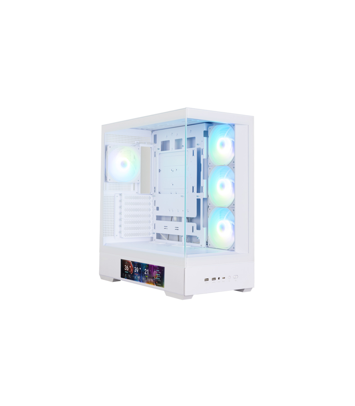 Zalman P40 DS WHITE. Factor de forma: Midi Tower, Tipo: PC, Color del producto: Blanco. Tipo de visualizador: LCD, Diagonal de la pantalla: 23,1 cm (9.1"), Resolucin de la pantalla: 1920 x 462 Pixeles. Ventiladores laterales instalados: 3x 120 mm, Dimetro de ventiladores secundarios soportados: 120 mm, Ventiladores traseros instalados: 1x 120 mm. Tamaos de disco duro soportados: 2.5,3.5". Ancho: 235 mm, Profundidad: 452 mm, Altura: 492 mm