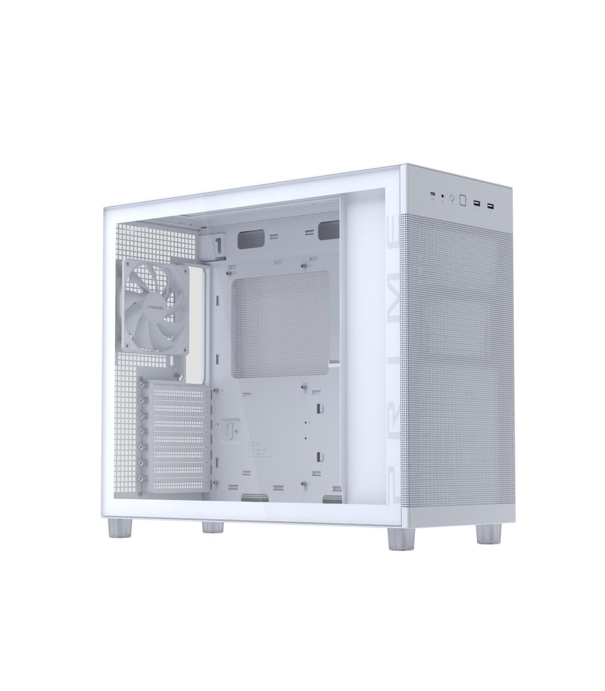 ASUS PRIME AP303 TG White. Tipo: PC, Color del producto: Blanco, Formas de factor de tarjeta madre soportadas: micro ATX, Mini-ITX, ATX. Ventiladores traseros instalados: 1x 120 mm, Diámetro de ventiladores traseros soportados: 120 mm, Diámetros de ventiladores superiores soportados: 120,140 mm. Tamaños de disco duro soportados: 2.5,3.5". Ancho: 215 mm, Profundidad: 485 mm, Altura: 425 mm. Ancho del paquete: 285 mm, Profundidad del paquete: 465 mm, Altura del paquete: 571 mm