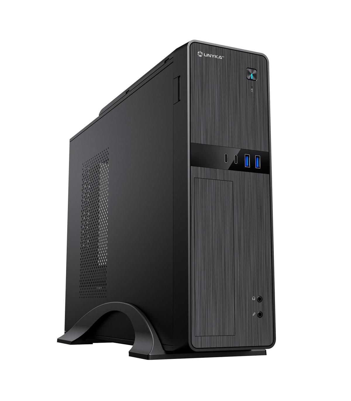 UNYKAch Caja Ordenador Micro ATX UK2011 Con Fuente de Alimentación SFX de 450W incluida, 2 Conectores USB 3.0 y 2 Conectores Type C (USB 2.0). Factor de forma: Escritorio, Tipo: PC, Color del producto: Negro. Fuente de alimentación: 450 W, Factores de forma de la fuente de alimentación compatibles: SFX. Tamaños de disco duro soportados: 2.5,3.5". Ancho: 99 mm, Profundidad: 405 mm, Altura: 314 mm. Ancho del paquete: 155 mm, Profundidad del paquete: 449 mm, Altura del paquete: 349 mm