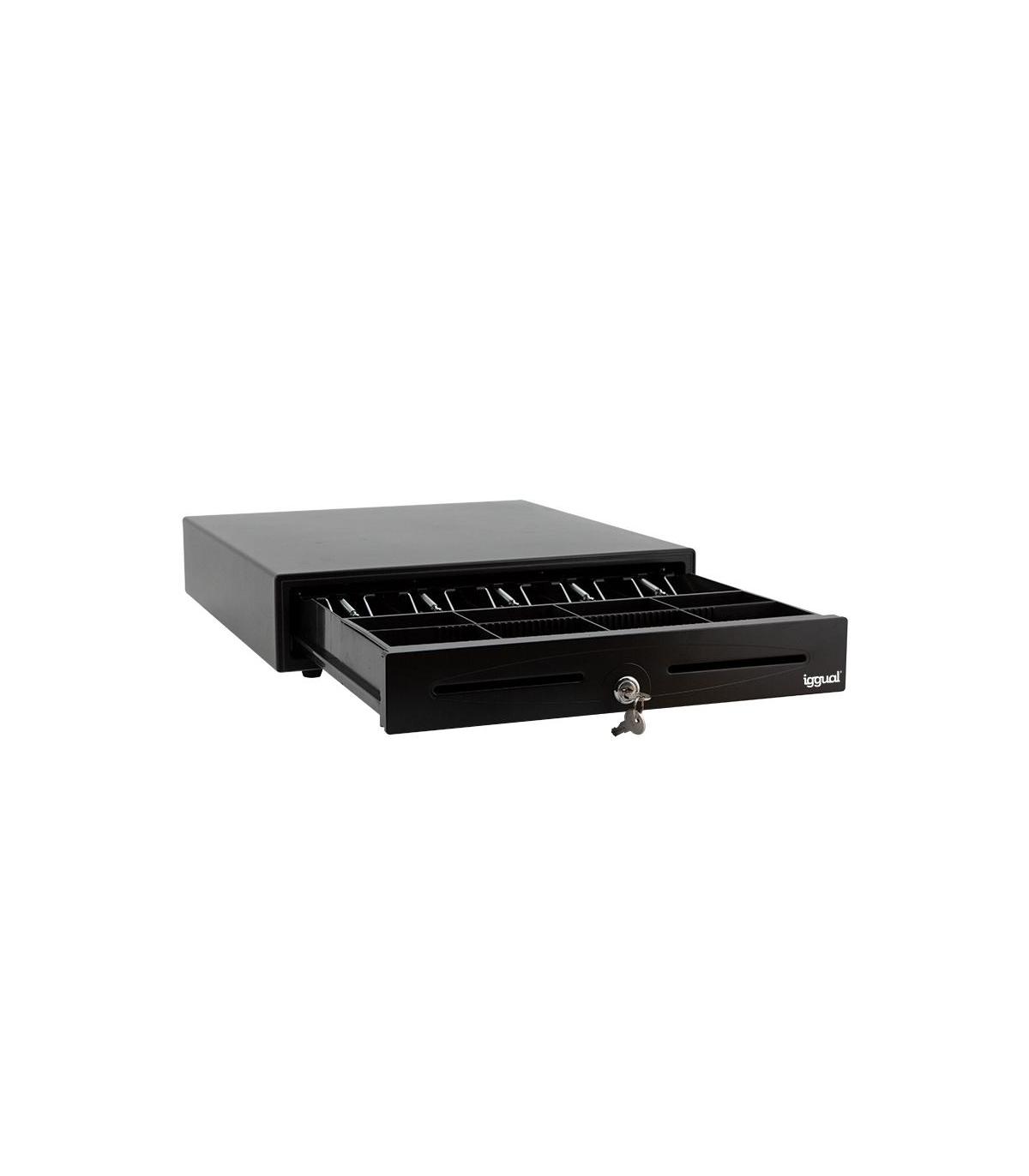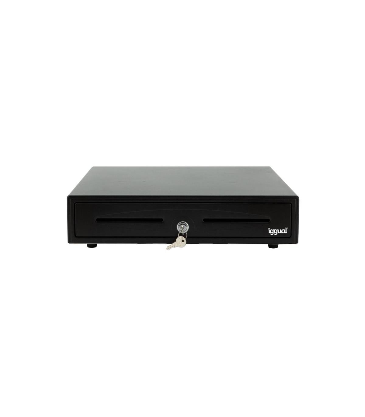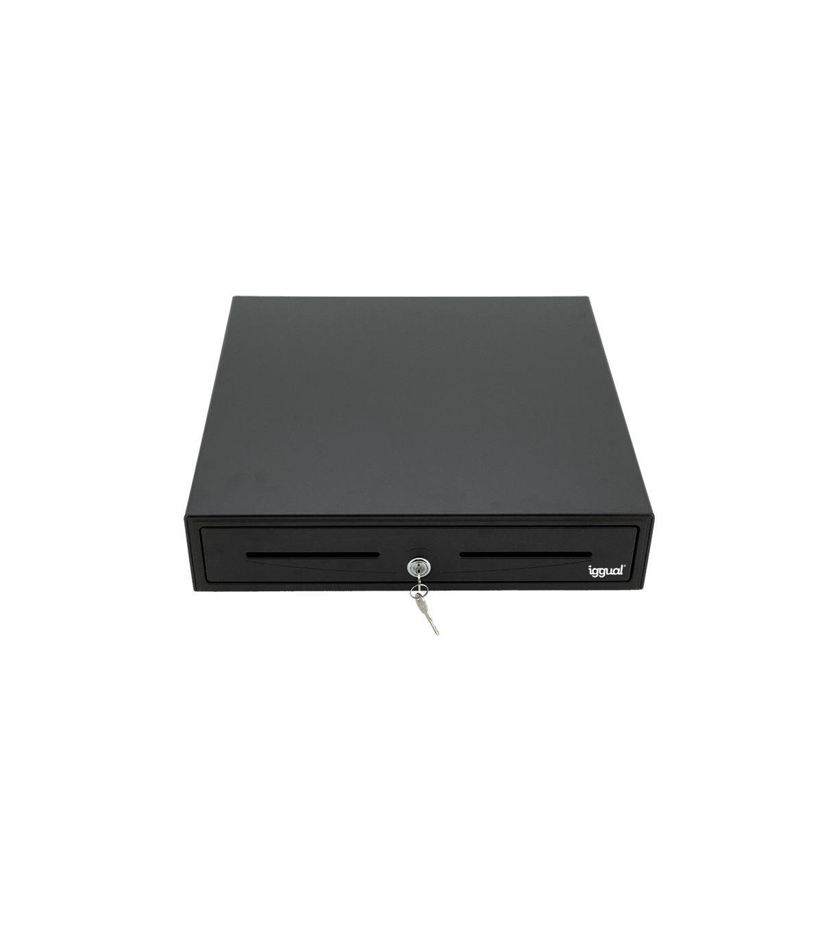 iggual Cajón Portamonedas IRON-50 42cm 5+8 negro. Tipo de producto: Cajón de efectivo automático y manual, Material de la carcasa: Metal, Color del producto: Negro. Ancho: 420 mm, Profundidad: 405 mm, Altura: 100 mm. Número de llaves incluidas: 2 pieza(s), Cables incluidos: Teléfono (RJ-11), Longitud de cable: 1 m