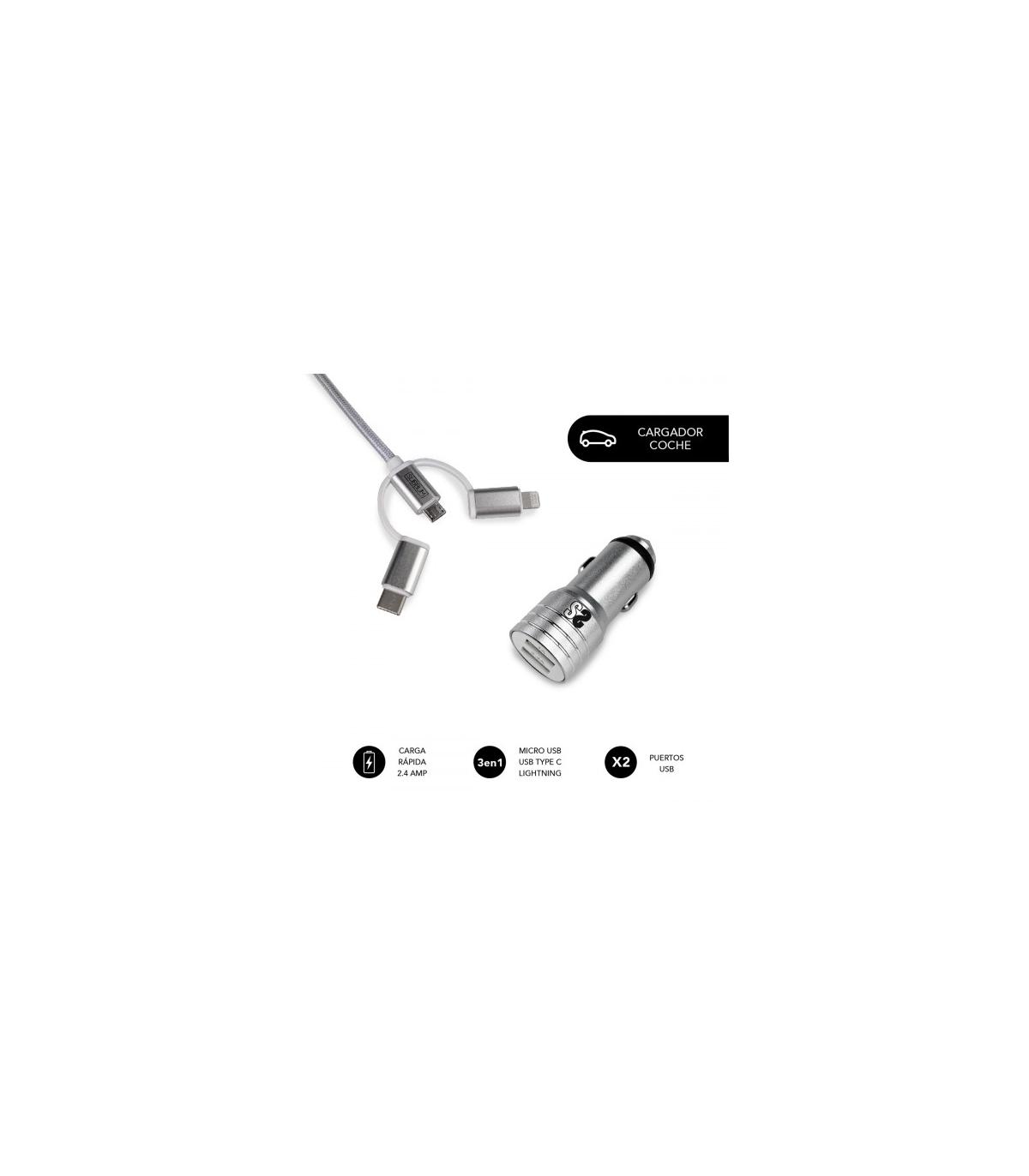 SUBBLIM Cargador Coche 2xUSB Dual Car Charger Alum 2.4A + Cable 3 In 1 Silver