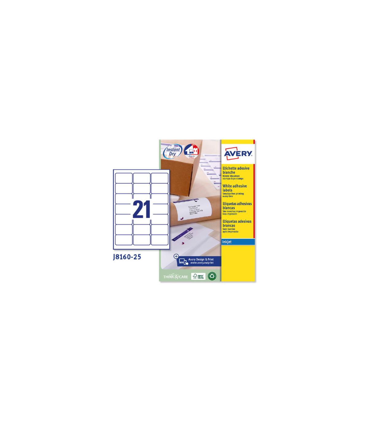 PAQUETE 25 HOJAS ETIQUETAS BLANCAS QUICK DRY-IMPRESORAS DE INYECCIN DE TINTA-63,5X38,1 MM AVERY J8160-25