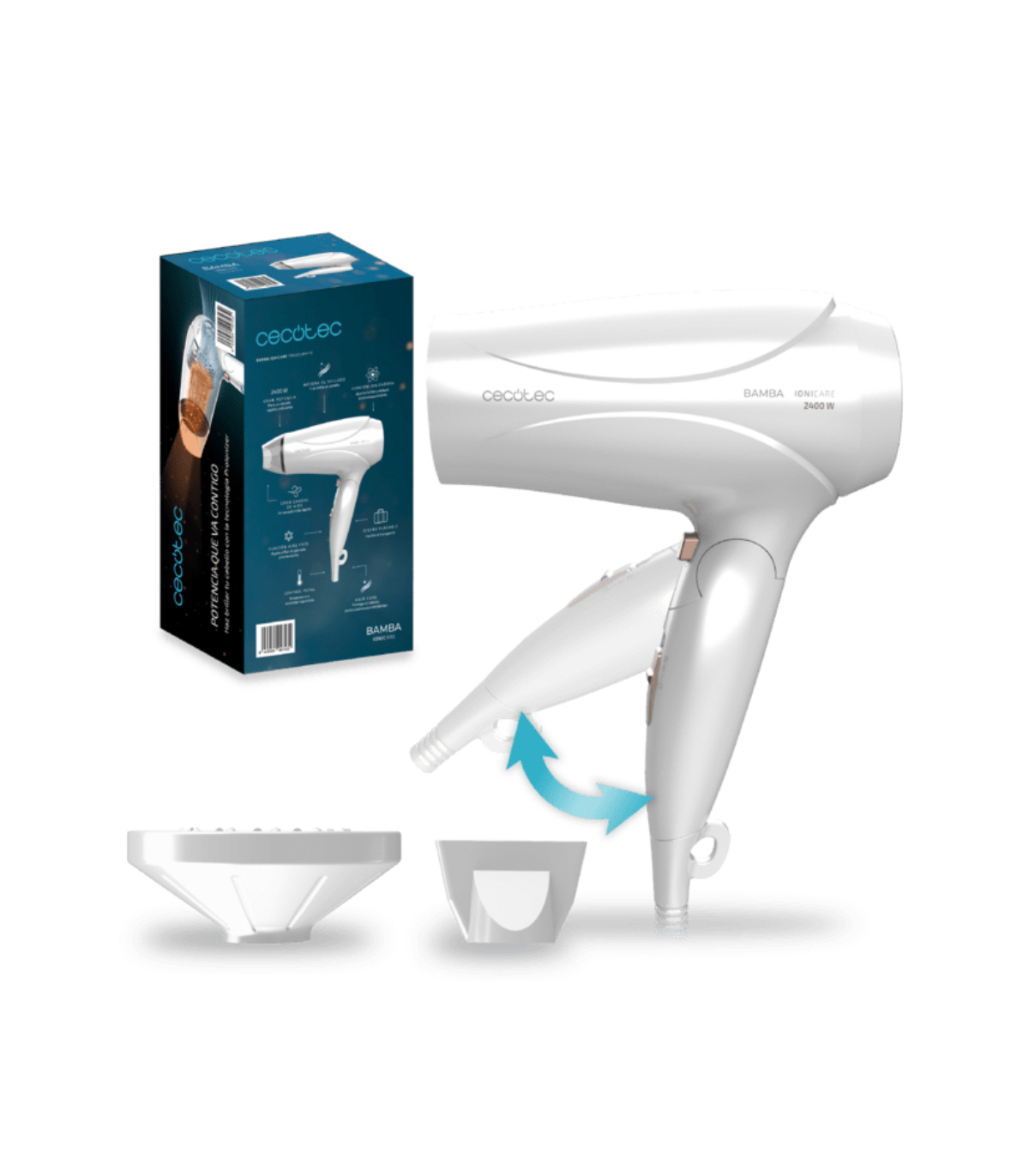 Bamba IoniCare TravelWhiteIon realUn secado potente para todo tipo de peinadosGran caudal de aireGracias al gran caudal de aire de nuestro Bamba secador IoniCare 5400 Power&Go, el cabello se seca forma mucho ms eficiente sin daar el color y brillo de tu pelo.Control totalControl total. Gracias al ajuste de la temperatura y la velocidad podrs elegir los ajustes perfectos para cualquier peinado. Cuenta con dos posiciones de velocidad (Turbo/Medio) y dos posiciones de temperaturas (Calor/Medio)Pro StyleNuestro secador compacto Bamba secador IoniCare 5400 Power&Go mejora el sellado de la cutcula del cabello de forma rpida para fijar el peinado, con un acabado ultra brillante.Aire froEl botn de aire fro proporciona un caudal real de aire fro constante que ayuda a fijar el peinado para que dure perfecto durante ms tiempo. Adems, evita daos en el cabello sellando ms rpidamente la cutcula.Funcin Pro IonizerFuncin Pro Ionizer. Los iones de nuestro secador aportan brillo al cabello y potencian el efecto antiencrespamiento de forma natural, para que el acabado sea de un pelo sano y bonito.Llvatelo donde quierasSecador ultracompacto con mango plegable, para que sea mucho ms cmodo de almacenar y de transportar, ahorrando sitio en tu maleta o en tu casa sin sacrificar la potencia de un secador tradicional.Gran potenciaNuestro secador Bamba IoniCare 5400 Power&Go cuenta con un potente motor profesional de nueva generacin de 2400 W para secar el cabello de forma ms rpida y eficiente.