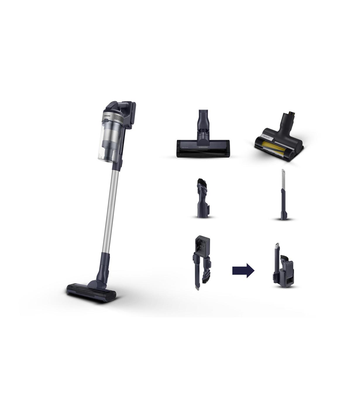 Samsung VS15A60AGR5. Tipo de producto: Aspiradora escoba, Tipo de depósito: Sin bolsa, Color del producto: Negro, Plata. Tipo de limpiador: Secar, Método de separación de la suciedad: Multiciclónico, Superficies de limpieza: Alfombra, Suelo duro. Fuente de energía: Batería, Potencia máx. de entrada: 410 W, Potencia del motor: 150 W. Ancho del paquete: 214 mm, Profundidad del paquete: 265 mm, Altura del paquete: 757 mm. Ancho: 250 mm, Profundidad: 203 mm, Altura: 1120 mm