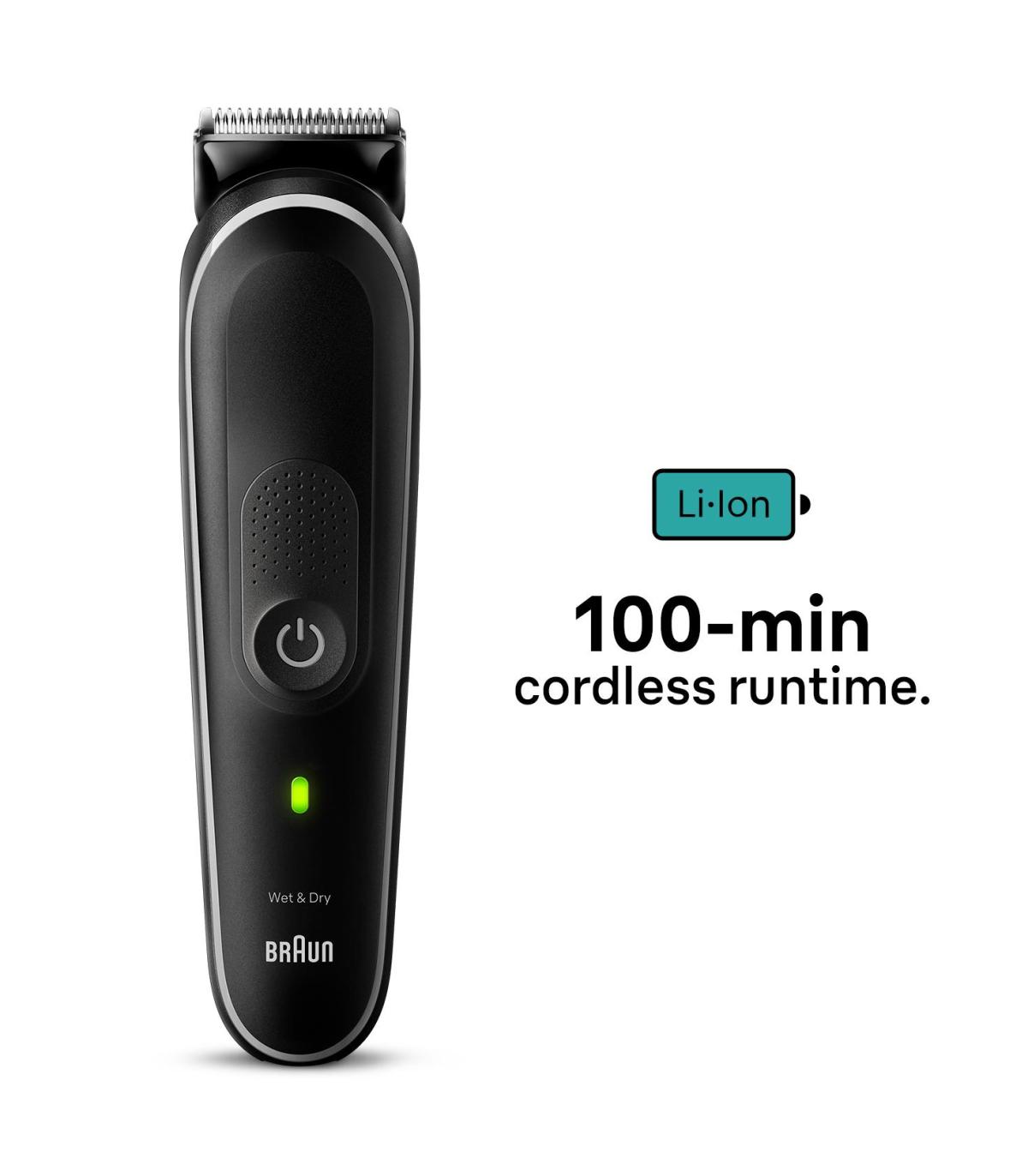 Braun MGK5440. Color del producto: Negro, Longitud mínima del cabello: 0,5 mm, Longitud máxima del cabello: 2,1 cm. Fuente de energía: Batería, Tiempo de funcionamiento: 100 min, Tipo de batería: Batería integrada. País de origen: China. Ancho: 137 mm, Profundidad: 57 mm, Altura: 282 mm. Ancho del paquete: 275 mm, Profundidad del paquete: 190 mm, Altura del paquete: 113 mm