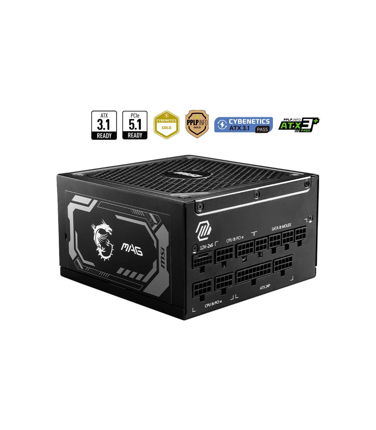 MSI MAG A1250GL PCIE5. Potencia total: 1250 W, Voltaje de entrada AC: 100 - 240 V, Frecuencia de entrada AC: 50/60 Hz. Alimentador de energía para tarjeta madre: 24-pin ATX, Longitud del cable de alimentación de la placa base: 60 cm, Longitud del cable de alimentación SATA: 500 mm. Utilizar con: PC, Factor de forma de fuente de alimentación (PSU): ATX, Certificación 80 PLUS: 80 PLUS Gold. Color del producto: Negro, Tipo de enfriamiento: Activo, Diámetro de ventilador: 13,5 cm. Cables incluidos: CPU, PCIe, Peripheral (Molex), SATA