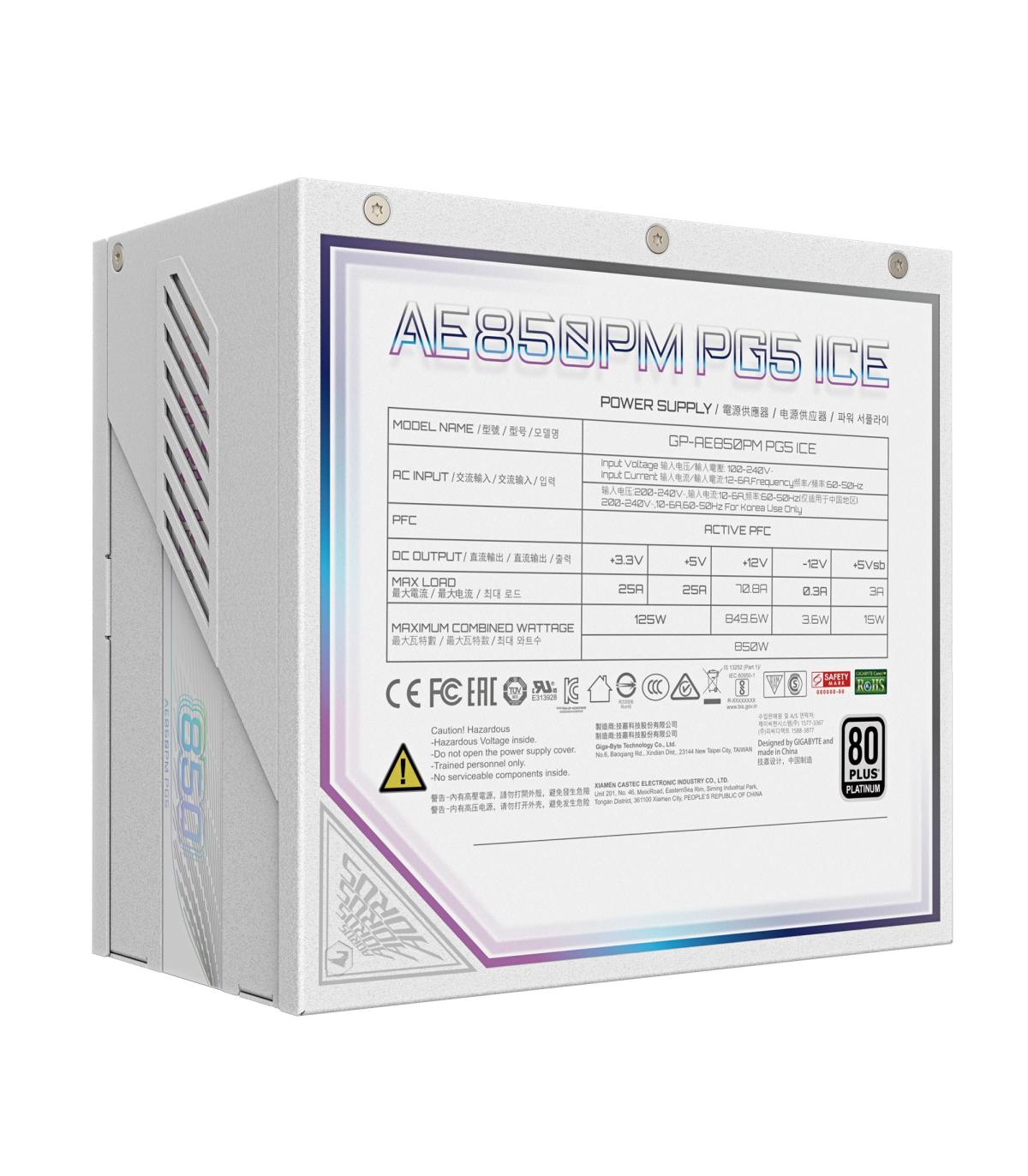 GIGABYTE AORUS ELITE P850W ICE Fuente de Alimentación - PCIe 5.0, 80 PLUS Platinum, Diseño completamente modular, Ventilador de 120 mm, Compatible con ATX 3.0, Enchufe UE, 850 W, 100 - 240 V, 50/60 Hz, 12 A, Activo, 125 W