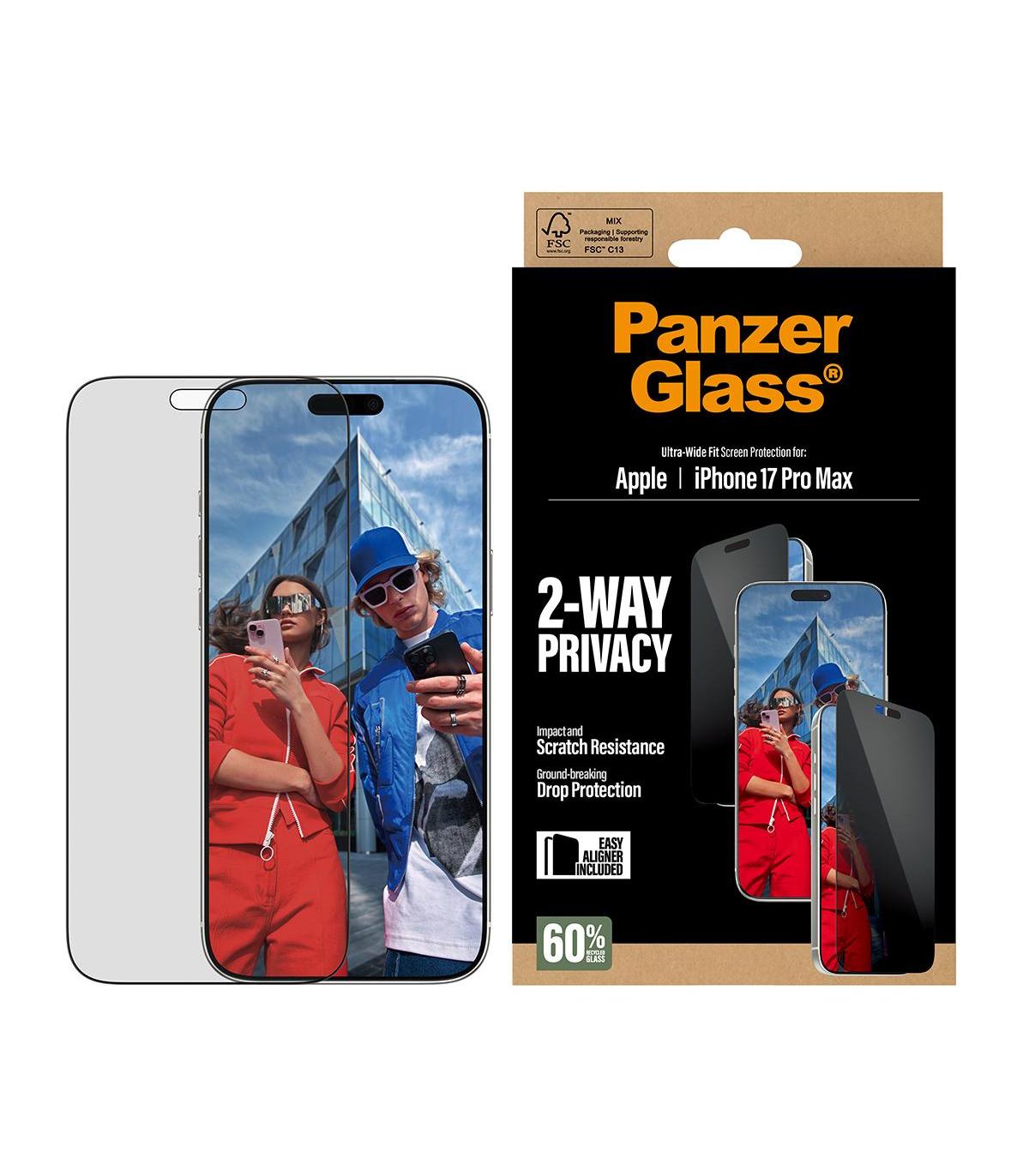 PanzerGlass ® 2-Way Privacy Screen Protector iPhone 17 Pro Max | Ultra-Wide Fit w. EasyAligner. Marca compatible: Apple, Compatibilidad: Apple - iPhone 17 Pro Max. Aplicación en seco. Funciones de protección: Resistente a rayones, Resistente a golpes. Función de filtrado de privacidad, Material: Vidrio templado, Tereftalato de polietileno (PET), Silicona, Color del producto: Transparente. Cantidad por paquete: 1 pieza(s)