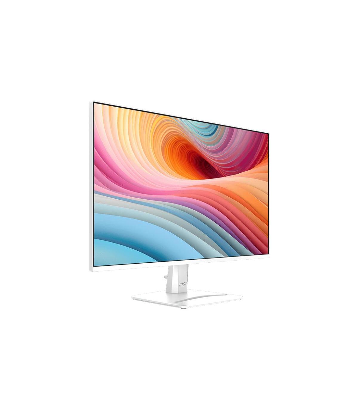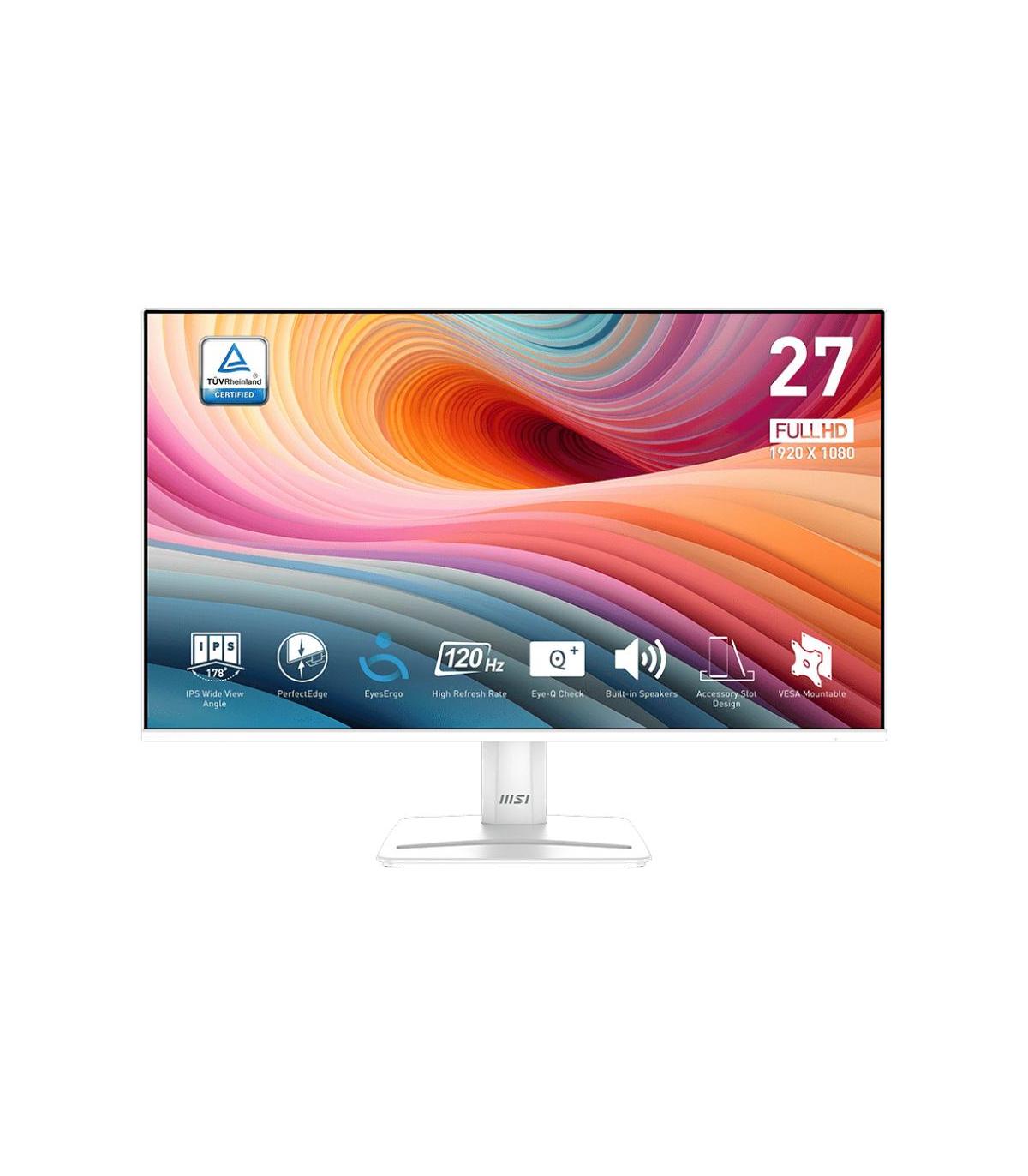 MSI Pro MP275W E2. Diagonal de la pantalla: 68,6 cm (27"), Resolución de la pantalla: 1920 x 1080 Pixeles, Tipo HD: Full HD, Tecnología de visualización: LED, Tiempo de respuesta: 4 ms, Relación de aspecto nativa: 16:9, Ángulo de visión, horizontal: 178°, Ángulo de visión, vertical: 178°. Altavoces incorporados. montaje VESA. Color del producto: Blanco