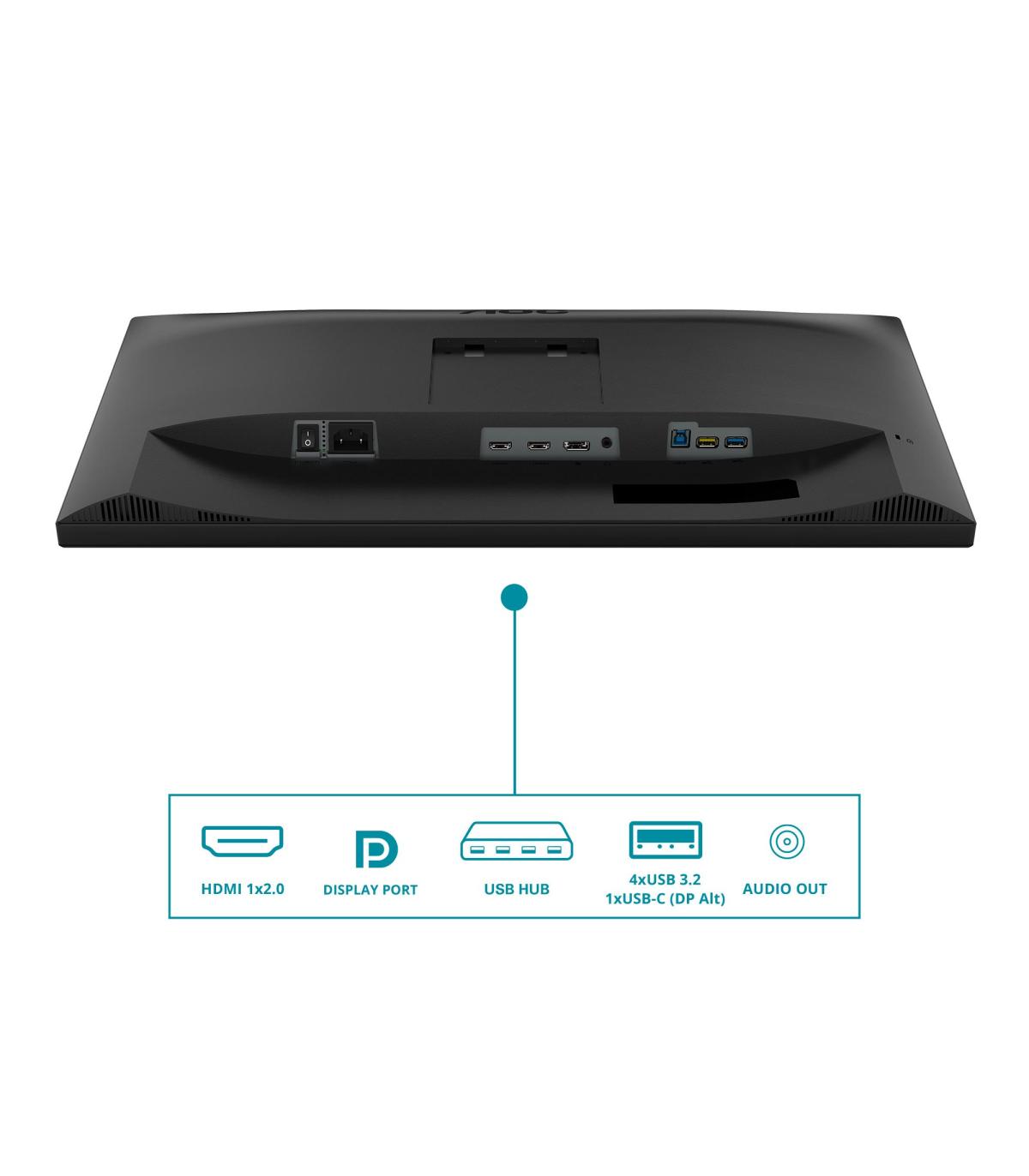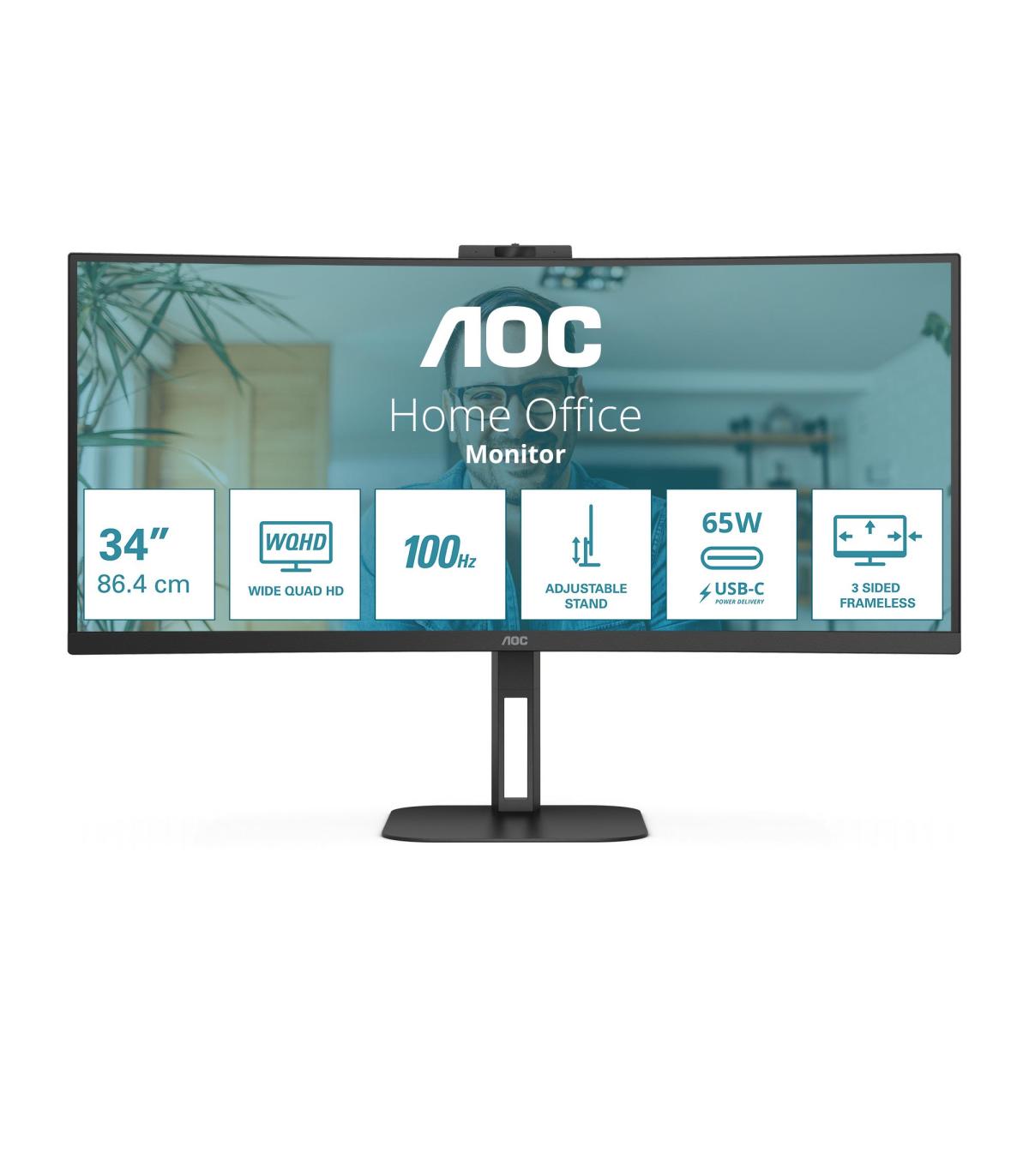 AOC V5 CU34V5C/BK. Diagonal de la pantalla: 86,4 cm (34"), Resolución de la pantalla: 3440 x 1440 Pixeles, Tipo HD: Wide Quad HD, Tecnología de visualización: LED, Tiempo de respuesta: 4 ms, Relación de aspecto nativa: 21:9, Ángulo de visión, horizontal: 178°, Ángulo de visión, vertical: 178°. Altavoces incorporados. Conector USB incorporado, Versión de conector USB: 3.2 Gen 1 (3.1 Gen 1). montaje VESA, Ajustes de altura. Color del producto: Negro