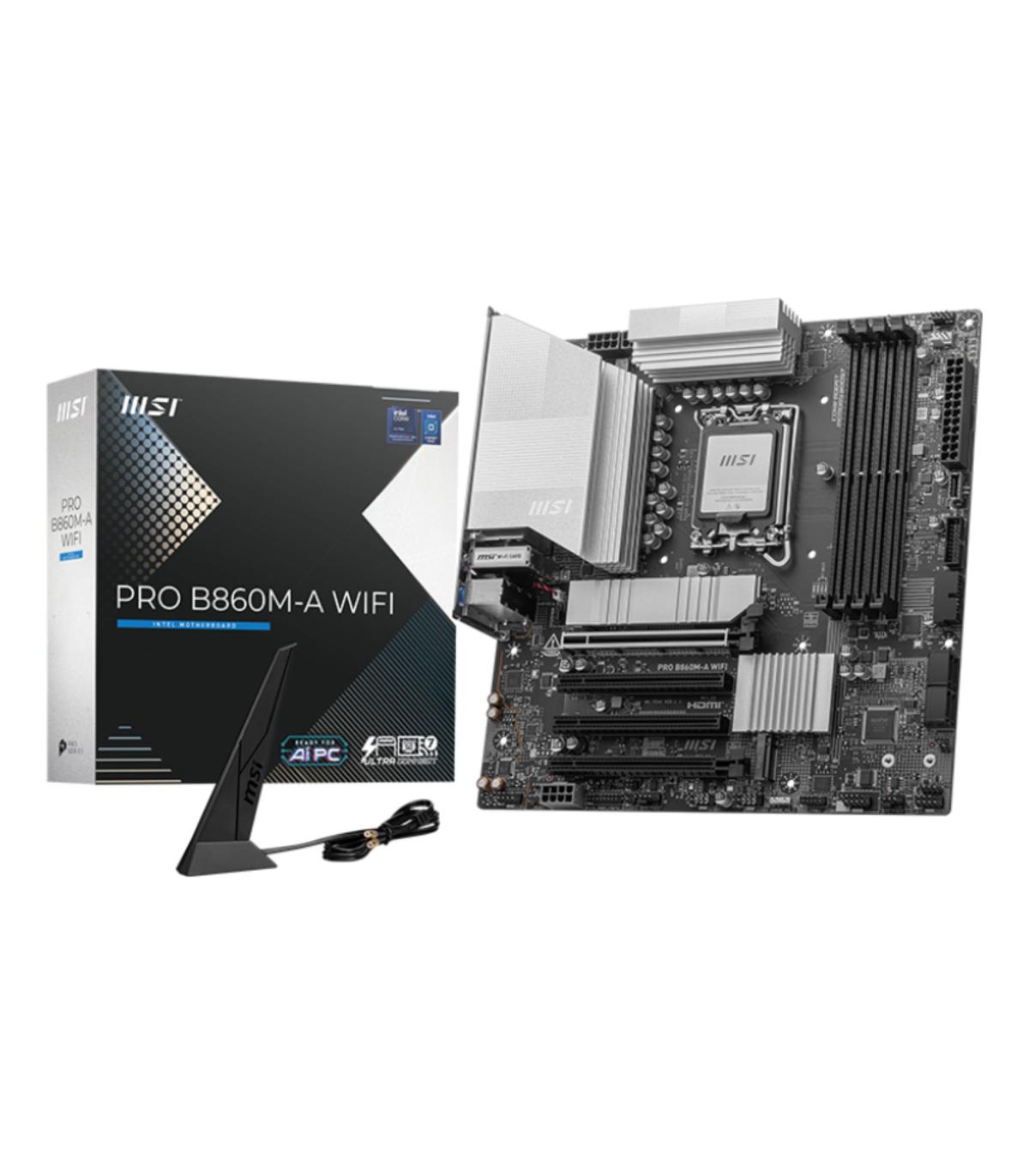 MSI PRO B860M-A WIFI. Fabricante de procesador: Intel, Socket de procesador: LGA 1851 (Socket V1), Procesador compatible: Intel Core Ultra (Series 2). tipos de memoria compatibles: DDR5-SDRAM, Memoria interna máxima: 256 GB, Tipo de ranuras de memoria: DIMM. Interfaces de disco de almacenamiento soportados: M.2, Micro SATA III, Tipos de unidades de almacenamiento admitidas: HDD & SSD, Niveles RAID: 0, 1, 5, 10. Tipo de interfaz ethernet: 5 Gigabit Ethernet, Estándar Wi-Fi: Wi-Fi 7 (802.11be), Wi-Fi estándares: 802.11a, 802.11b, 802.11g, Wi-Fi 4 (802.11n), Wi-Fi 5 (802.11ac), Wi-Fi 6 (802.11ax), Wi-Fi 6E.... Componente para: PC, Factor de forma: micro ATX, Familia del chipset: AMD