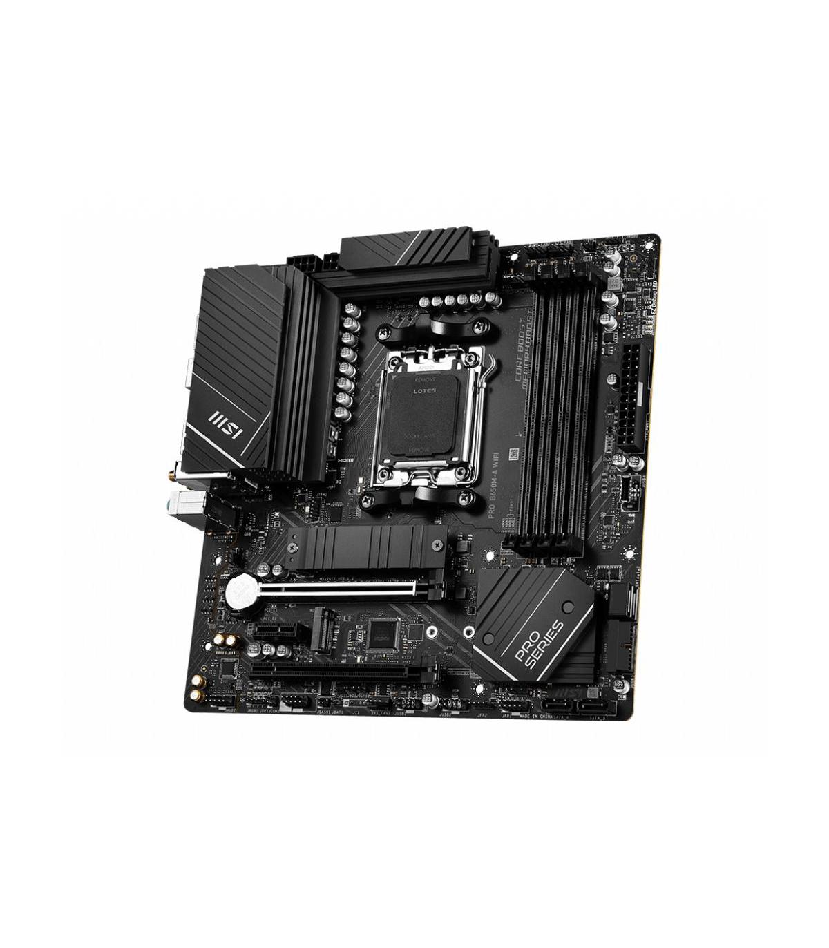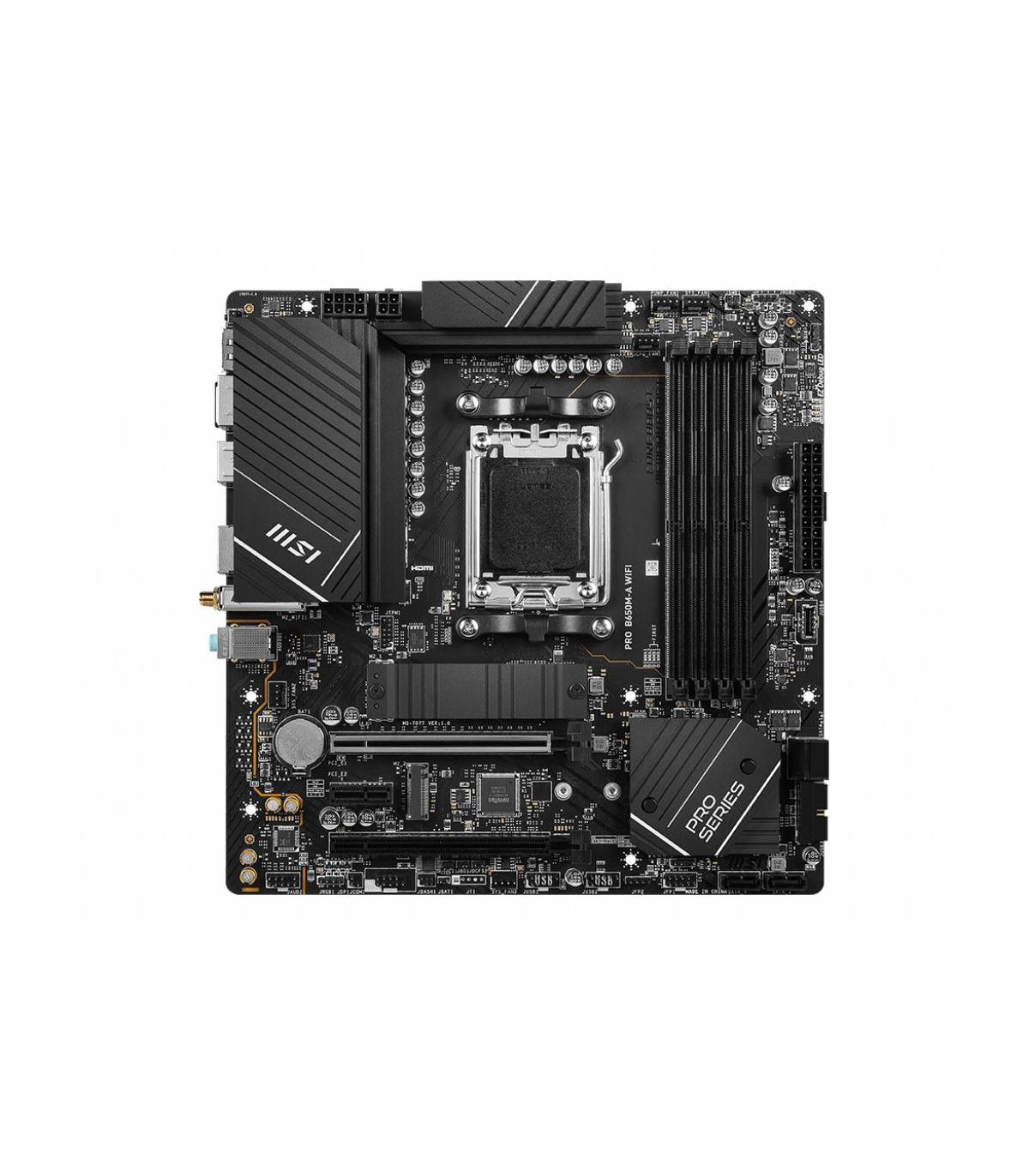 MSI PRO B650M-A WIFI. Fabricante de procesador: AMD, Socket de procesador: Zócalo AM5, Procesador compatible: AMD Ryzen 7000 Series. tipos de memoria compatibles: DDR5-SDRAM, Memoria interna máxima: 128 GB, Velocidades de reloj de memoria soportadas: 4800,5000,5200,5400,5600,5800,6000,6200,6400 MHz. Interfaces de disco de almacenamiento soportados: M.2, SATA, Niveles RAID: 0, 1, 10. Tipo de interfaz ethernet: 2.5 Gigabit Ethernet, Controlador LAN: Realtek RTL8125-BG, Estándar Wi-Fi: Wi-Fi 6E (802.11ax). Componente para: PC, Factor de forma: micro ATX, Familia del chipset: AMD