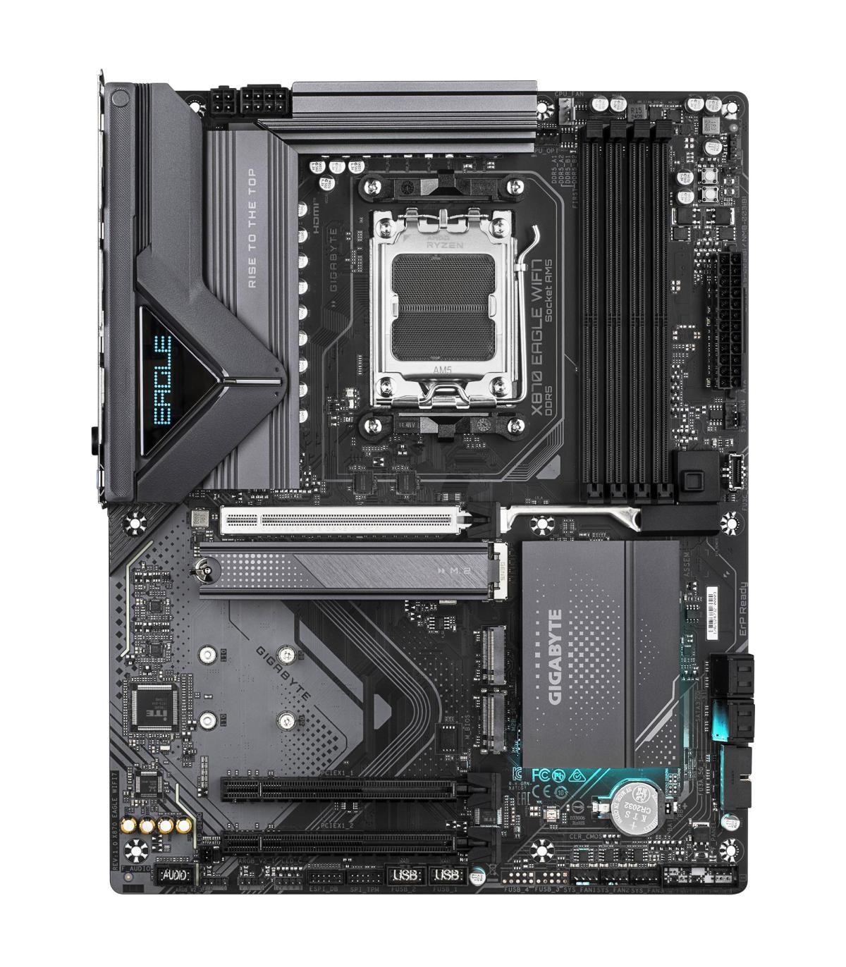 GIGABYTE X870 EAGLE WIFI7 Placa Base - Compatible con CPUs AMD Ryzen 9000, 14+2+2 fases VRM, hasta 8000MHz DDR5 (OC), 1xPCIe 5.0 + 2xPCIe 4.0, Wi-Fi 7, LAN 2.5GbE, USB 4. Fabricante de procesador: AMD, Socket de procesador: Zócalo AM5, Procesador compatible: AMD Ryzen 7000 Series, AMD Ryzen 8000 Series, AMD Ryzen 9000 Series. tipos de memoria compatibles: DDR5-SDRAM, Memoria interna máxima: 256 GB, Tipo de ranuras de memoria: DIMM. Interfaces de disco de almacenamiento soportados: M.2, SATA III, Tipos de unidades de almacenamiento admitidas: HDD & SSD, Niveles RAID: 0, 1, 10. Tipo de interfaz ethernet: 2.5 Gigabit Ethernet, Controlador LAN: Realtek RTL8125, Estándar Wi-Fi: Wi-Fi 7 (802.11be). Componente para: PC, Factor de forma: ATX, Familia del chipset: AMD