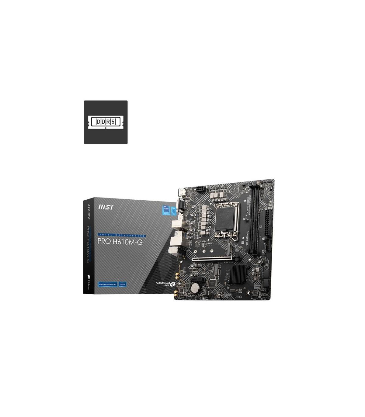 MSI PRO H610M-G. Fabricante de procesador: Intel, Socket de procesador: LGA 1700, Procesador compatible: Intel® Core™ i9. tipos de memoria compatibles: DDR5-SDRAM, Memoria interna máxima: 96 GB, Tipo de ranuras de memoria: DIMM. Interfaces de disco de almacenamiento soportados: M.2, SATA III, Tipos de unidades de almacenamiento admitidas: SSD. Tipo de interfaz ethernet: Gigabit Ethernet. Componente para: PC, Factor de forma: micro ATX, Familia del chipset: Intel