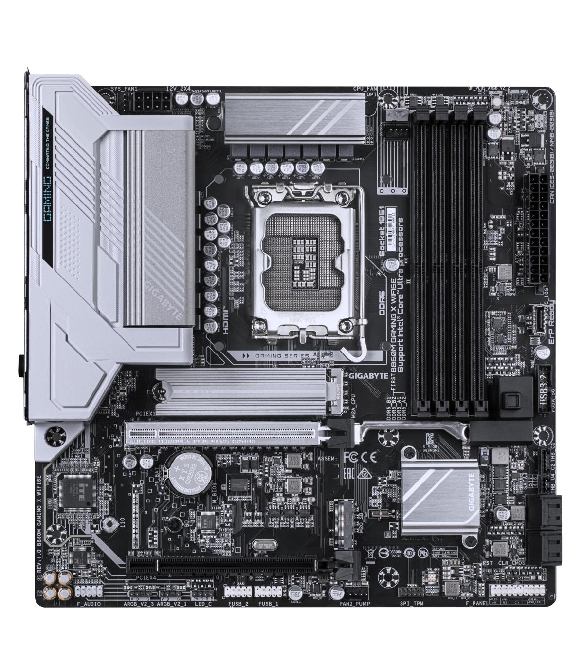 GIGABYTE B860M GAMING X WIFI6E Placa base - CPUs Intel Core Ultra, VRM de 8+1+2+2 fases, hasta 9200MHz DDR5, 1xPCIe 5.0 + 1xPCIe 4.0 M.2, LAN 2,5 GbE, WIFI 6E, USB 4. Fabricante de procesador: Intel, Socket de procesador: LGA 1851 (Socket V1), Procesador compatible: Intel Core Ultra (Serie 1), Intel Core Ultra (Series 2). tipos de memoria compatibles: DDR5-SDRAM, Memoria interna máxima: 256 GB, Tipo de ranuras de memoria: DIMM. Interfaces de disco de almacenamiento soportados: M.2, SATA III, Tipos de unidades de almacenamiento admitidas: HDD & SSD, Niveles RAID: 0, 1, 5, 10. Máxima resolución: 4096 x 2160 Pixeles. Tipo de interfaz ethernet: 2.5 Gigabit Ethernet, Controlador LAN: Realtek RTL8125, Estándar Wi-Fi: Wi-Fi 6E (802.11ax)