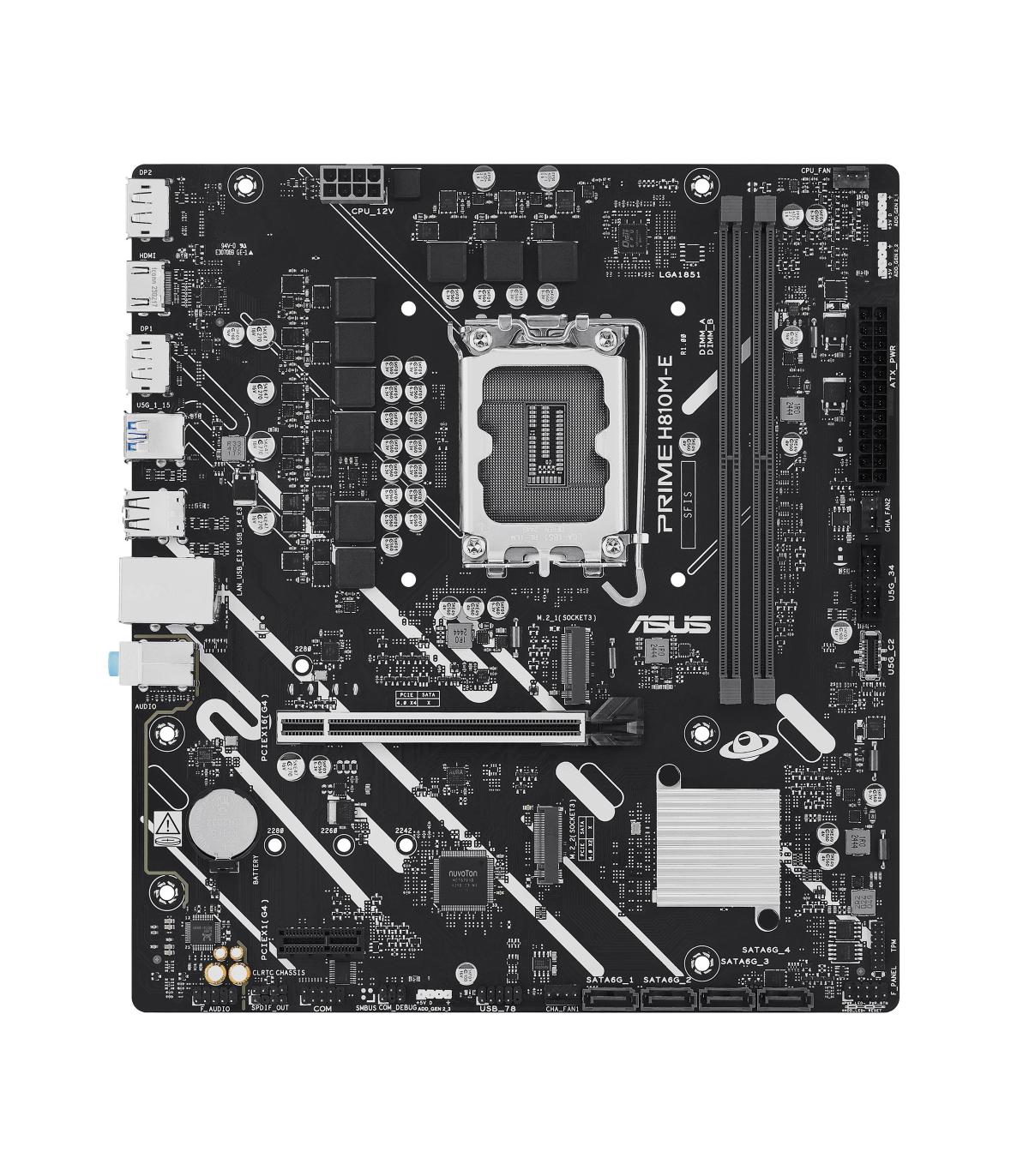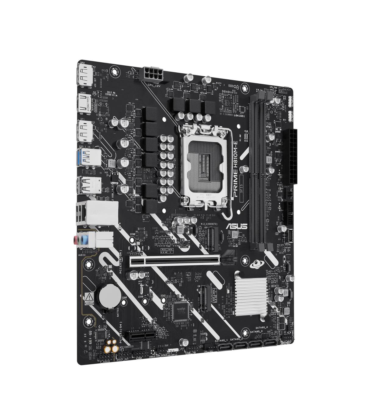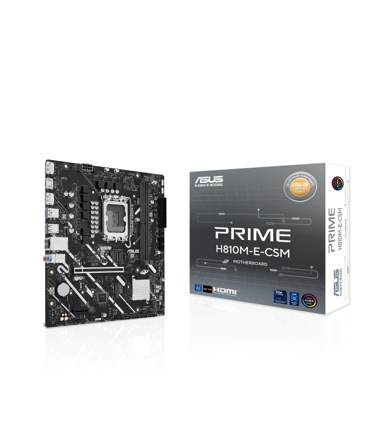 ASUS PRIME H810M-E-CSM. Fabricante de procesador: Intel, Socket de procesador: LGA 1851 (Socket V1), Procesador compatible: Intel Core Ultra (Series 2). tipos de memoria compatibles: DDR5-SDRAM, Memoria interna máxima: 128 GB, Tipo de ranuras de memoria: DIMM. Interfaces de disco de almacenamiento soportados: M.2, SATA III, Tipos de unidades de almacenamiento admitidas: HDD & SSD. Tipo de interfaz ethernet: Gigabit Ethernet. Componente para: PC, Factor de forma: micro ATX, Familia del chipset: Intel