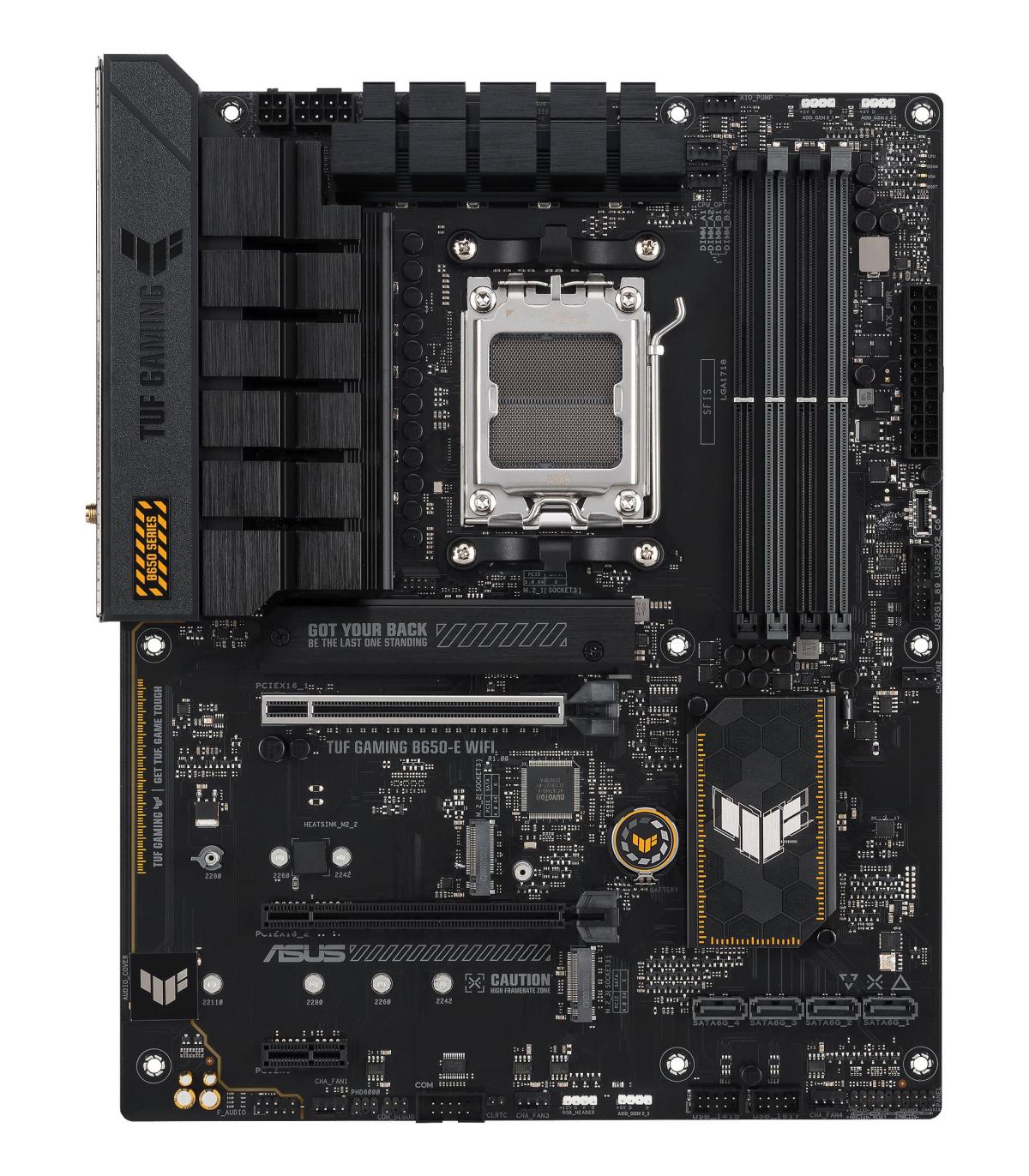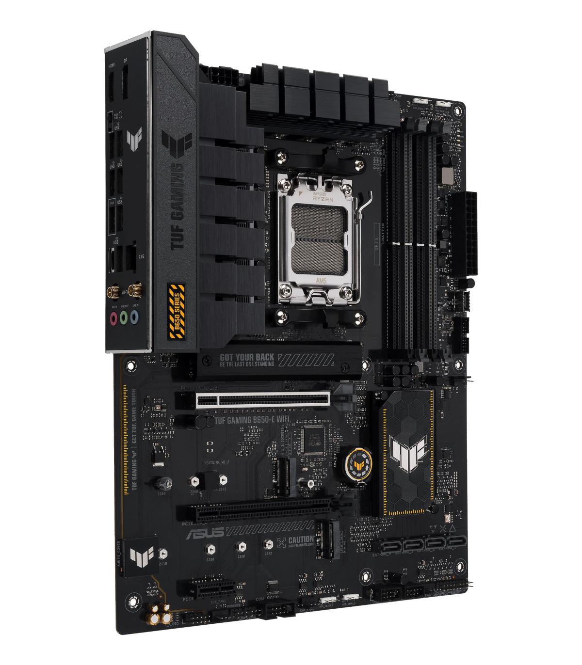 ASUS TUF GAMING B650-E WIFI. Fabricante de procesador: AMD, Socket de procesador: Zócalo AM5, Sockets de procesador soportados: Zócalo AM5. tipos de memoria compatibles: DDR5-SDRAM, Memoria interna máxima: 192 GB, Tipo de ranuras de memoria: DIMM. Interfaces de disco de almacenamiento soportados: M.2, SATA III, Tipos de unidades de almacenamiento admitidas: HDD & SSD, Niveles RAID: 0, 1, 10. Tipo de interfaz ethernet: 2.5 Gigabit Ethernet, Estándar Wi-Fi: Wi-Fi 6E (802.11ax), Wi-Fi estándares: 802.11a, 802.11b, 802.11g, Wi-Fi 4 (802.11n), Wi-Fi 5 (802.11ac), Wi-Fi 6 (802.11ax), Wi-Fi 6E.... Componente para: PC, Factor de forma: ATX, Familia del chipset: AMD