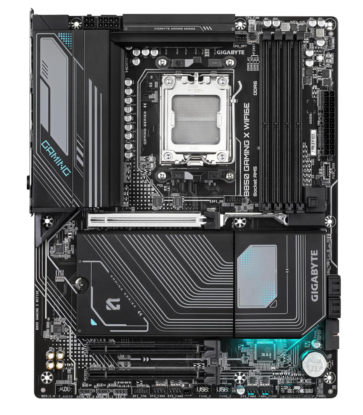 GIGABYTE B850 GAMING X WIFI6E Placa Base - Procesadores AMD Ryzen Serie 9000, VRM digital de 12+2+2 fases, hasta 8200MHz DDR5 (OC), 1xPCIe 5.0 + 2xPCIe 4.0 M.2, LAN 2.5G, WIFI 6E, USB 3.2 Gen 2x2. Fabricante de procesador: AMD, Socket de procesador: Zócalo AM5, Procesador compatible: AMD Ryzen 7000 Series, AMD Ryzen 8000 Series, AMD Ryzen 9000 Series. tipos de memoria compatibles: DDR5-SDRAM, Memoria interna máxima: 256 GB, Tipo de ranuras de memoria: DIMM. Interfaces de disco de almacenamiento soportados: M.2, SATA III, Tipos de unidades de almacenamiento admitidas: HDD & SSD, Niveles RAID: 0, 1, 10. Máxima resolución: 4096 x 2160 Pixeles. Tipo de interfaz ethernet: 2.5 Gigabit Ethernet, Estándar Wi-Fi: Wi-Fi 6E (802.11ax), Wi-Fi estándares: 802.11a, 802.11b, 802.11g, Wi-Fi 4 (802.11n), Wi-Fi 5 (802.11ac), Wi-Fi 6 (802.11ax), Wi-Fi 6E...