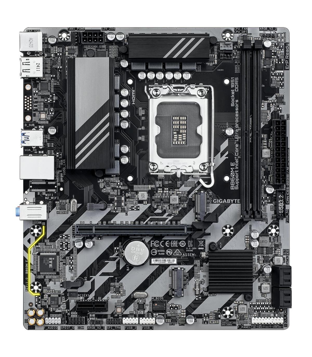 GIGABYTE B860M E Placa Base - Procesadores Intel Core Ultra Series, VRM de 4+1+2 fases, hasta 8800MHz DDR5 (O.C), 2xPCIe 4.0 M.2, LAN 1GbE, USB 3.2 Gen 1. Fabricante de procesador: Intel, Socket de procesador: LGA 1851 (Socket V1), Procesador compatible: Intel Core Ultra (Series 2). tipos de memoria compatibles: DDR5-SDRAM, Memoria interna máxima: 128 GB, Tipo de ranuras de memoria: DIMM. Interfaces de disco de almacenamiento soportados: M.2, PCI Express 4.0, SATA III, Tipos de unidades de almacenamiento admitidas: HDD & SSD, Niveles RAID: 0, 1, 5, 10. Máxima resolución: 4096 x 2160 Pixeles. Tipo de interfaz ethernet: Gigabit Ethernet, Controlador LAN: Realtek RTL8111H