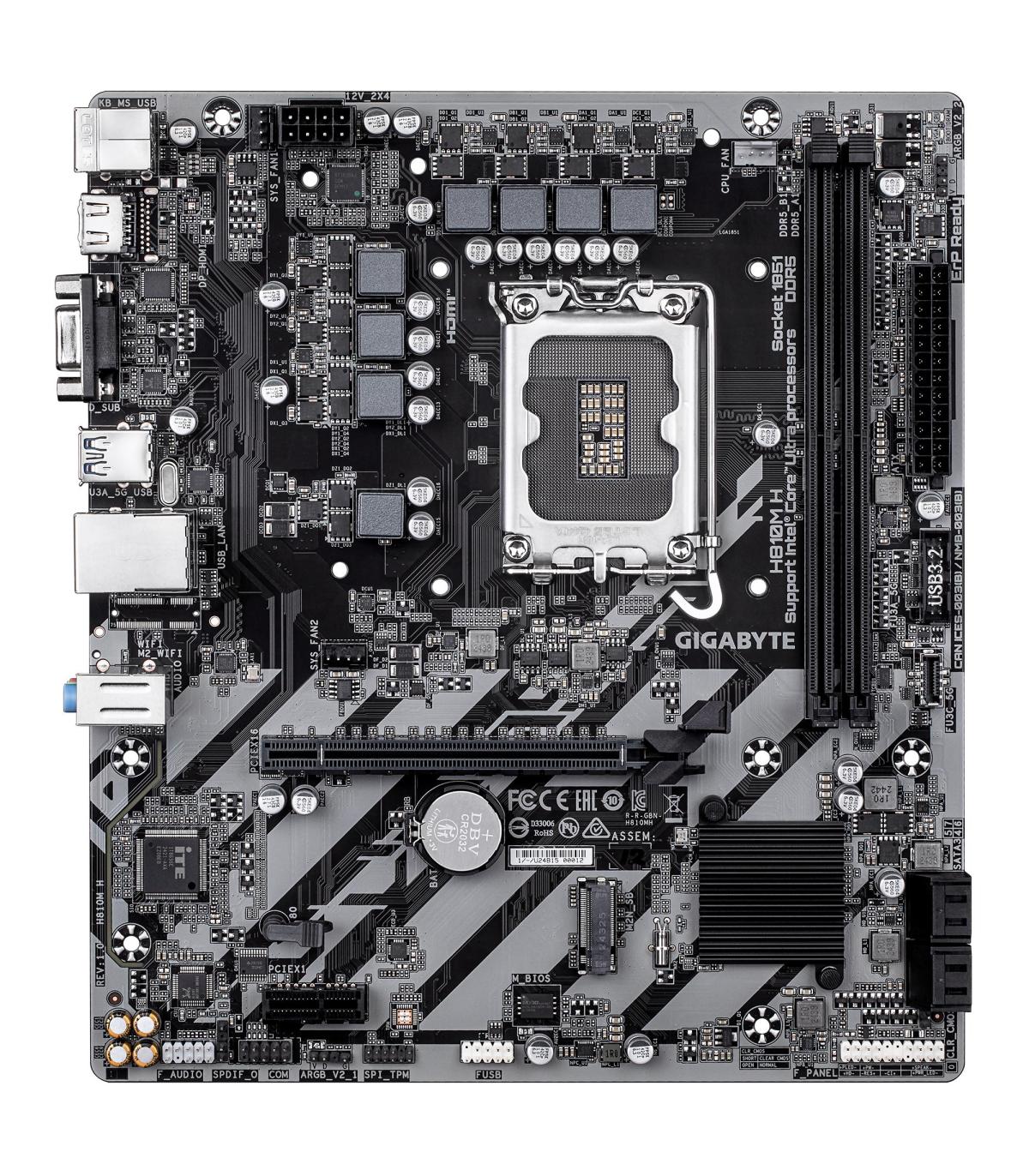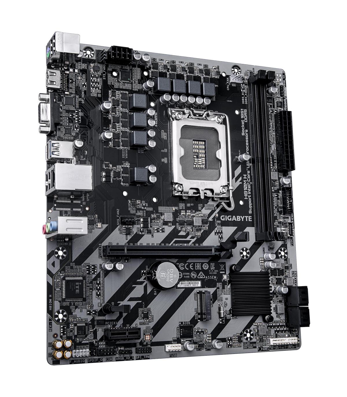 GIGABYTE H810M H Placa base - Procesadores Intel Core Ultra (Serie 2), VRM de 4+1+2 fases, hasta 6400 MHz DDR5, 1xPCIe 4.0 M.2, LAN 1GbE, USB 3.2 Gen 1. Fabricante de procesador: Intel, Socket de procesador: LGA 1851 (Socket V1), Procesador compatible: Intel Core Ultra (Series 2). tipos de memoria compatibles: DDR5-SDRAM, Memoria interna máxima: 128 GB, Tipo de ranuras de memoria: DIMM. Interfaces de disco de almacenamiento soportados: M.2, PCI Express 4.0, SATA III, Tipos de unidades de almacenamiento admitidas: HDD & SSD, Niveles RAID: 0, 1, 5, 10. Máxima resolución: 4096 x 2160 Pixeles. Tipo de interfaz ethernet: Gigabit Ethernet, Controlador LAN: Realtek RTL8111H
