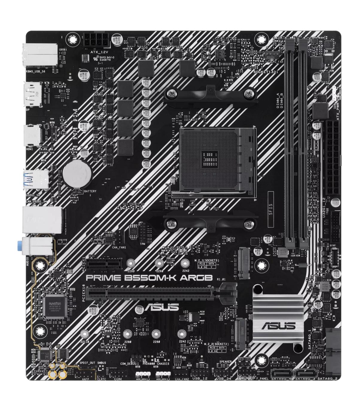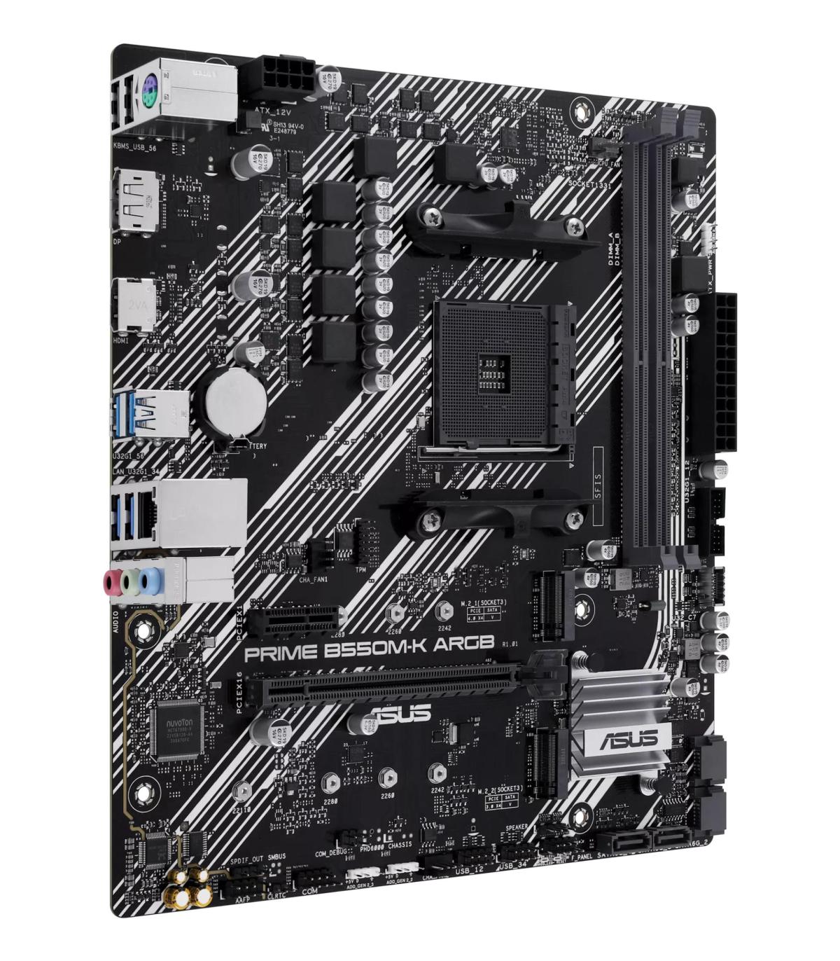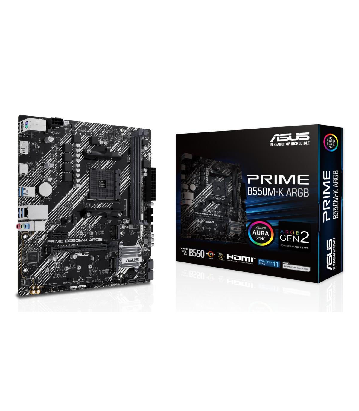 ASUS PRIME B550M-K ARGB. Fabricante de procesador: AMD, Socket de procesador: Zócalo AM4. tipos de memoria compatibles: DDR4-SDRAM, Memoria interna máxima: 64 GB, Tipo de ranuras de memoria: DIMM. Interfaces de disco de almacenamiento soportados: M.2, Tipos de unidades de almacenamiento admitidas: HDD & SSD, Niveles RAID: 0, 1, 10. Tipo de interfaz ethernet: Gigabit Ethernet. Componente para: PC, Factor de forma: micro ATX, Familia del chipset: AMD