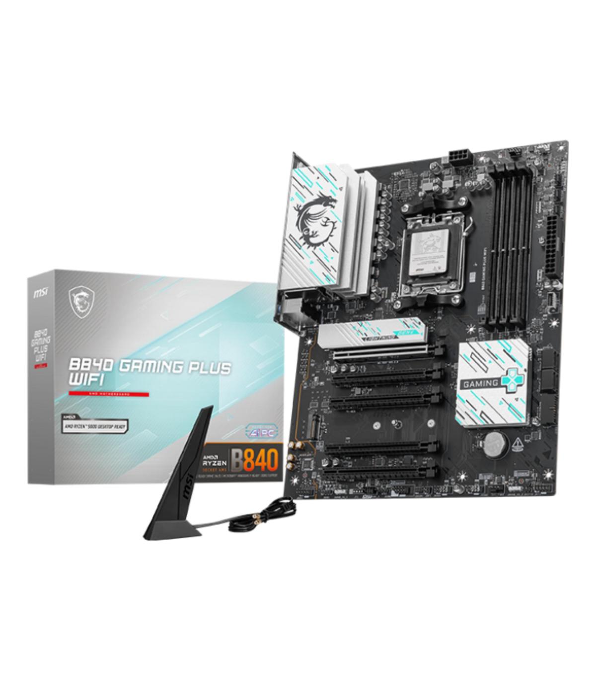 MSI B840 GAMING PLUS WIFI. Fabricante de procesador: AMD, Socket de procesador: Zócalo AM5, Procesador compatible: AMD Ryzen 7000 Series, AMD Ryzen 8000 Series, AMD Ryzen 9000 Series. tipos de memoria compatibles: DDR5-SDRAM, Memoria interna máxima: 256 GB, Tipo de ranuras de memoria: DIMM. Interfaces de disco de almacenamiento soportados: M.2, Micro SATA III, Tipos de unidades de almacenamiento admitidas: HDD & SSD, Niveles RAID: 0, 1, 10. Tipo de interfaz ethernet: 2.5 Gigabit Ethernet, Estándar Wi-Fi: Wi-Fi 7 (802.11be), Wi-Fi estándares: 802.11a, 802.11b, 802.11g, Wi-Fi 4 (802.11n), Wi-Fi 5 (802.11ac), Wi-Fi 6 (802.11ax), Wi-Fi 6E.... Componente para: PC, Factor de forma: ATX, Familia del chipset: AMD