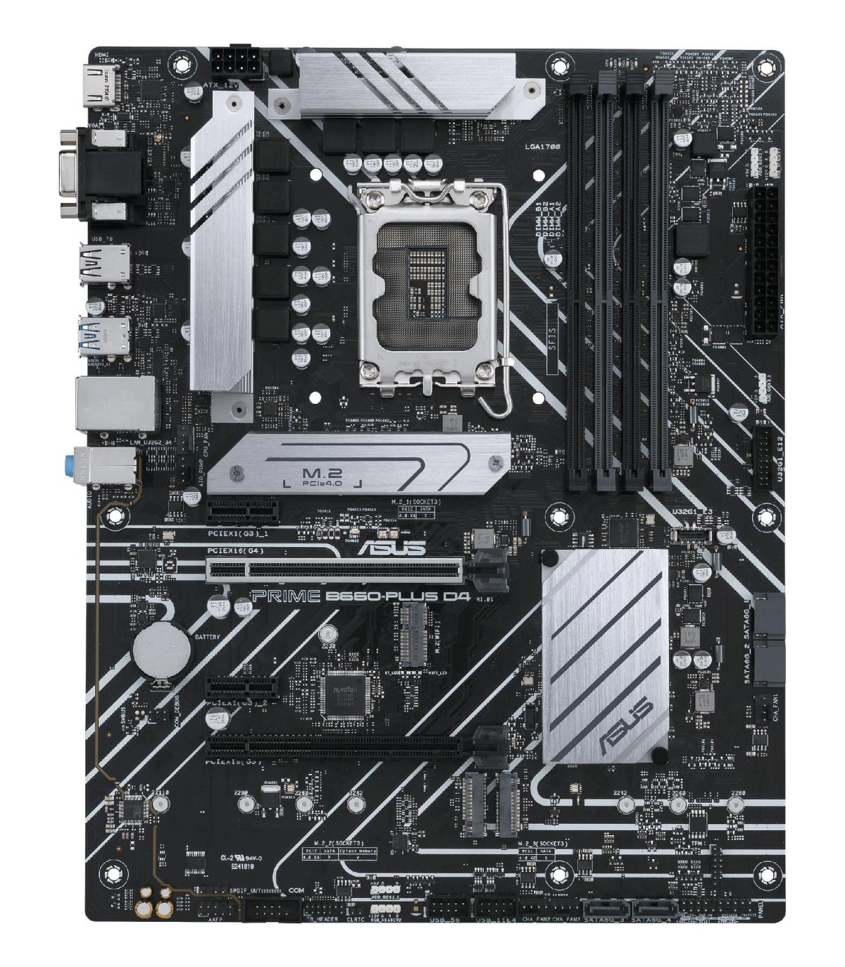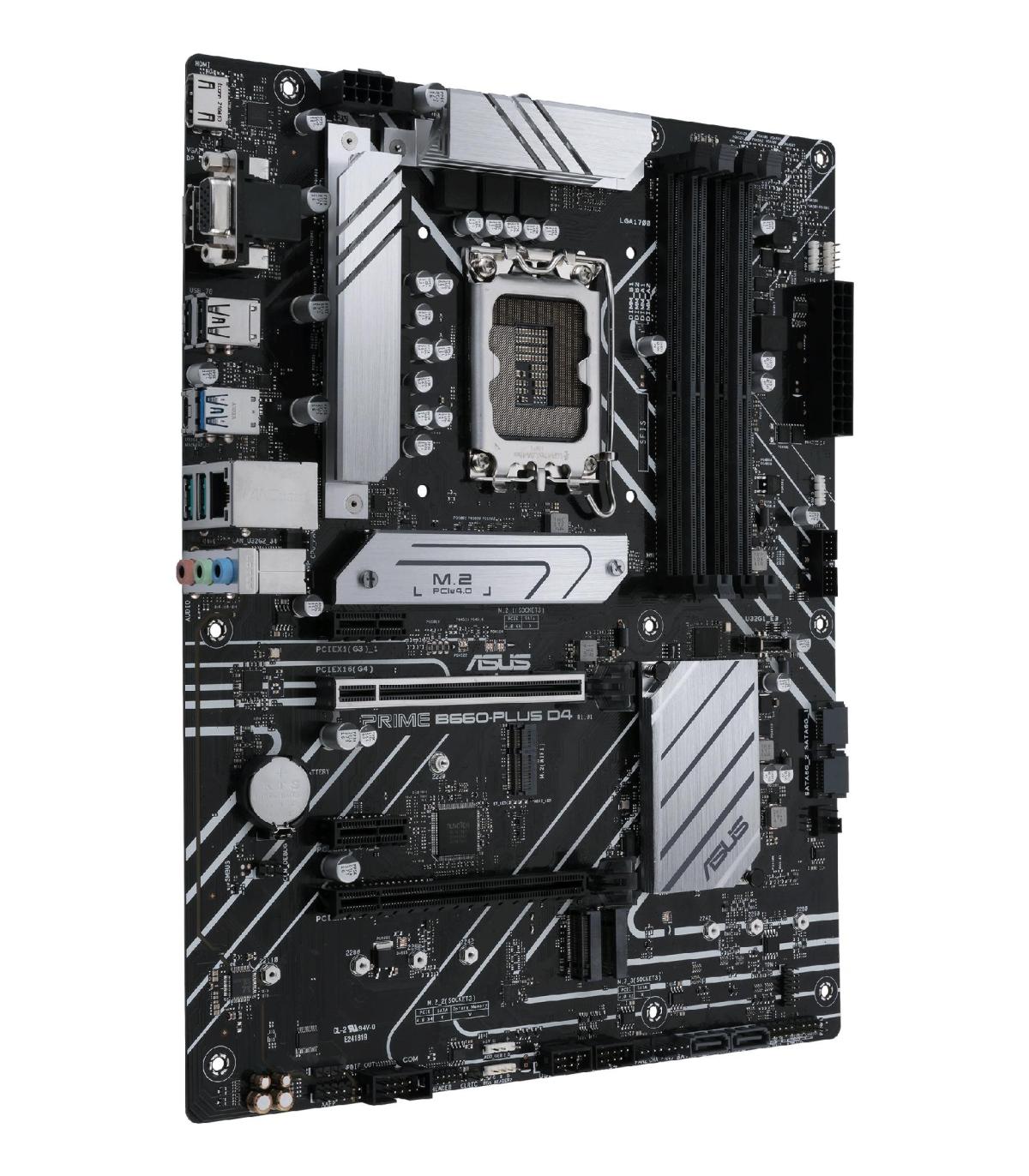 ASUS PRIME B660-PLUS D4. Fabricante de procesador: Intel, Socket de procesador: LGA 1700, Procesador compatible: Intel® Celeron®, Intel® Core™ i3, Intel® Core™ i5, Intel® Core™ i7, Intel® Core™ i9,.... tipos de memoria compatibles: DDR4-SDRAM, Memoria interna máxima: 128 GB, Tipo de ranuras de memoria: DIMM. Interfaces de disco de almacenamiento soportados: M.2, PCI Express 4.0, SATA III, Tipos de unidades de almacenamiento admitidas: HDD & SSD, Niveles RAID: 0, 1, 5, 10. Conector USB: USB tipo A, USB Tipo C. Tipo de interfaz ethernet: 2.5 Gigabit Ethernet