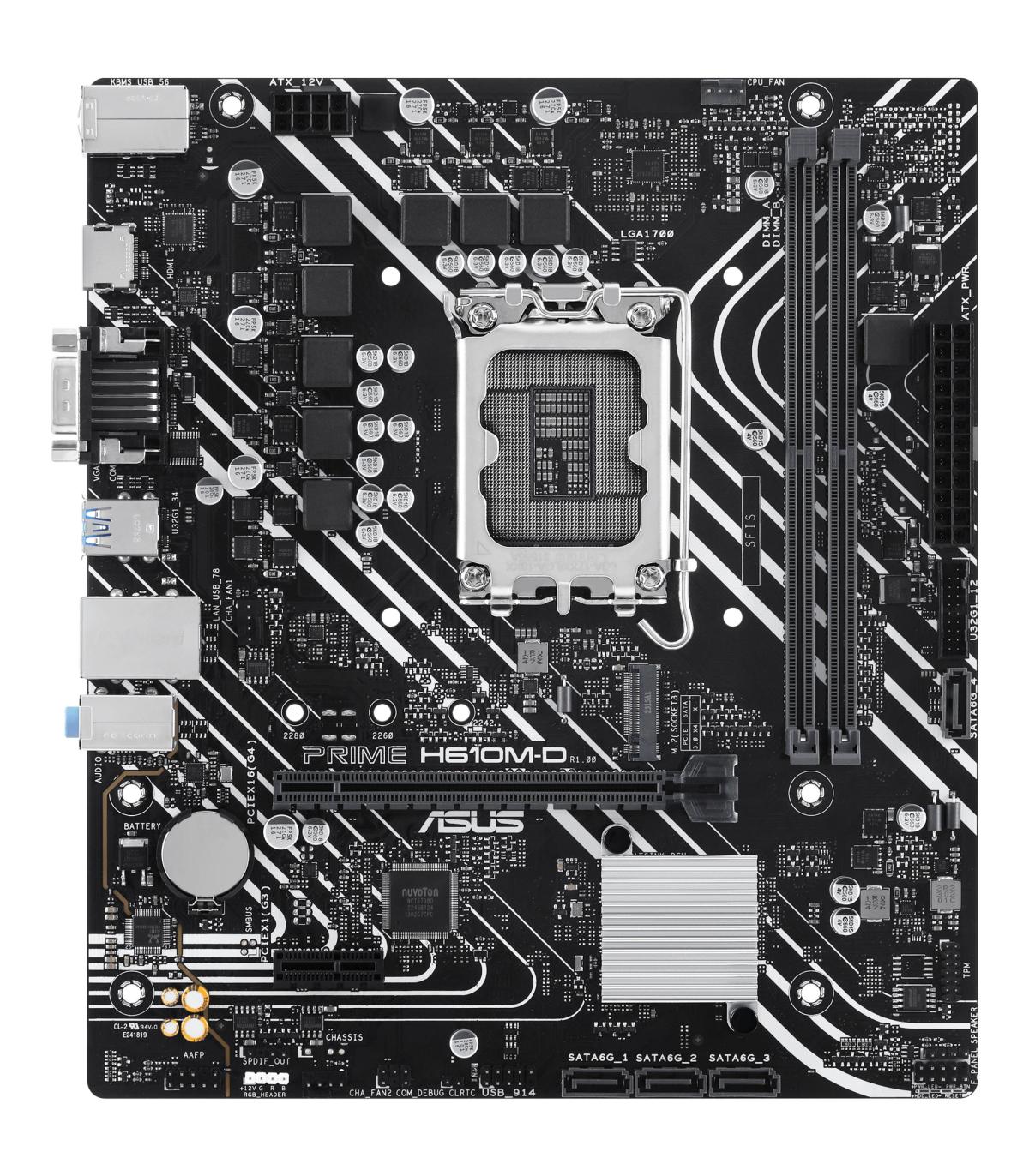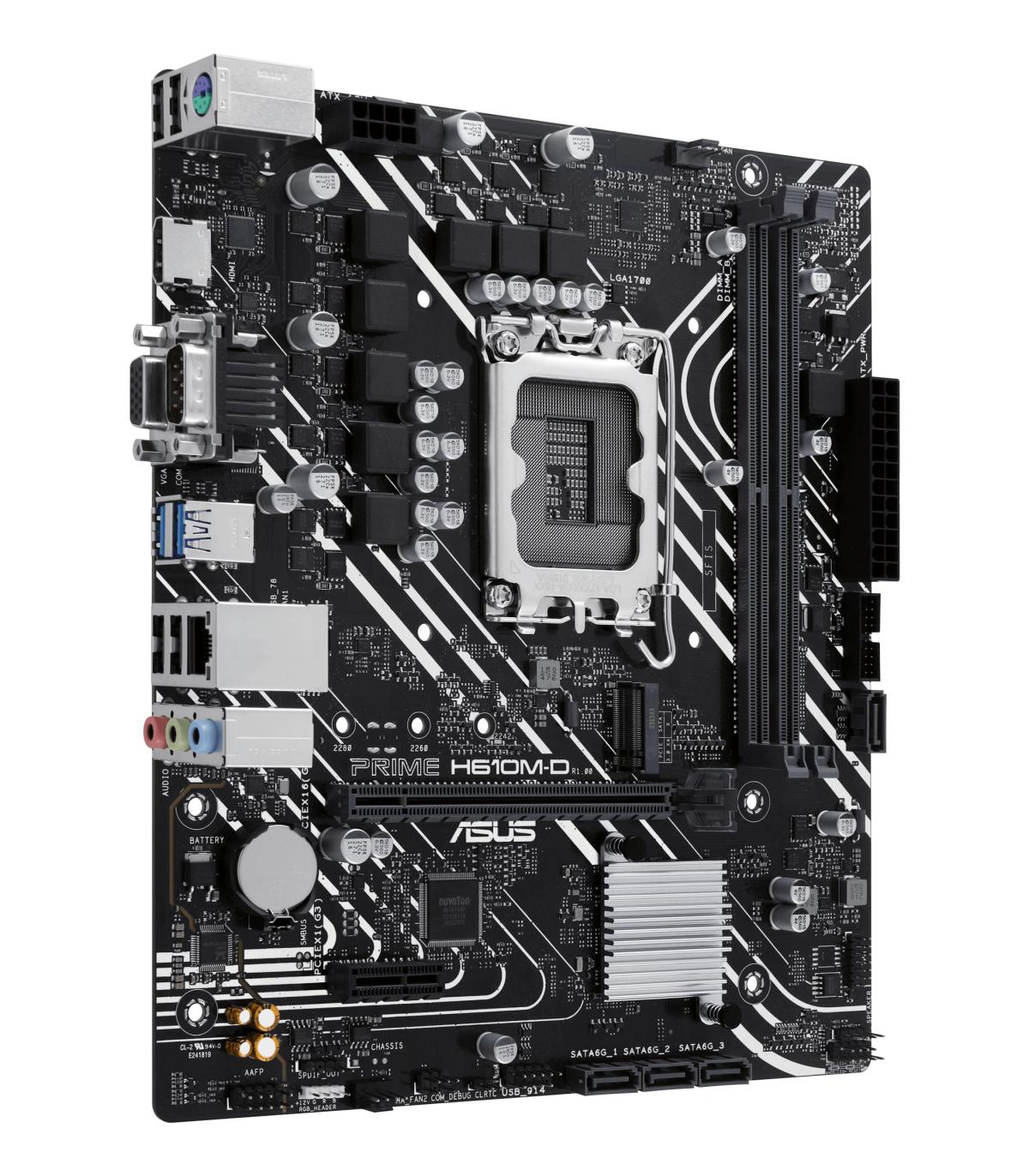 ASUS PRIME H610M-D. Fabricante de procesador: Intel, Socket de procesador: LGA 1700, Procesador compatible: Intel® Celeron®, Intel® Pentium® Gold, Intel® Core™ i3, Intel® Core™ i5, Intel® Core™.... tipos de memoria compatibles: DDR5-SDRAM, Memoria interna máxima: 96 GB, Tipo de ranuras de memoria: DIMM. Interfaces de disco de almacenamiento soportados: M.2, SATA III, Tipos de unidades de almacenamiento admitidas: HDD & SSD. Tipo de interfaz ethernet: Gigabit Ethernet. Componente para: PC, Factor de forma: micro ATX, Familia del chipset: Intel
