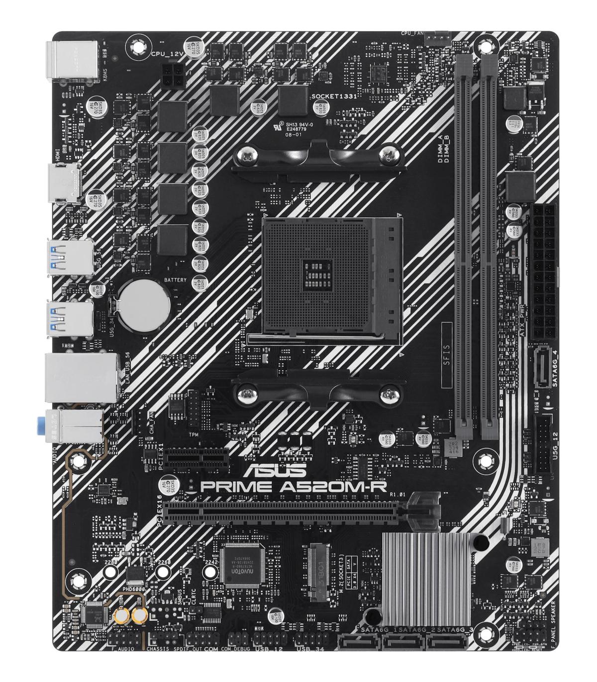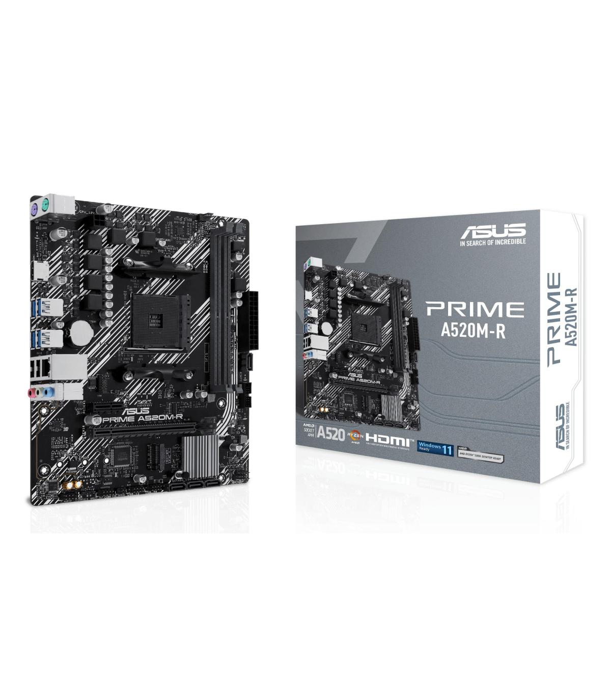 ASUS PRIME A520M-R. Fabricante de procesador: AMD, Socket de procesador: Zócalo AM4, Procesador compatible: AMD Ryzen 3000 Series, AMD Ryzen 5000 Series. tipos de memoria compatibles: DDR5-SDRAM, Memoria interna máxima: 64 GB, Tipo de ranuras de memoria: DIMM. Interfaces de disco de almacenamiento soportados: M.2, SATA III, Tipos de unidades de almacenamiento admitidas: HDD & SSD, Niveles RAID: 0, 1, 10. Tipo de interfaz ethernet: Gigabit Ethernet. Componente para: PC, Factor de forma: micro ATX, Familia del chipset: AMD