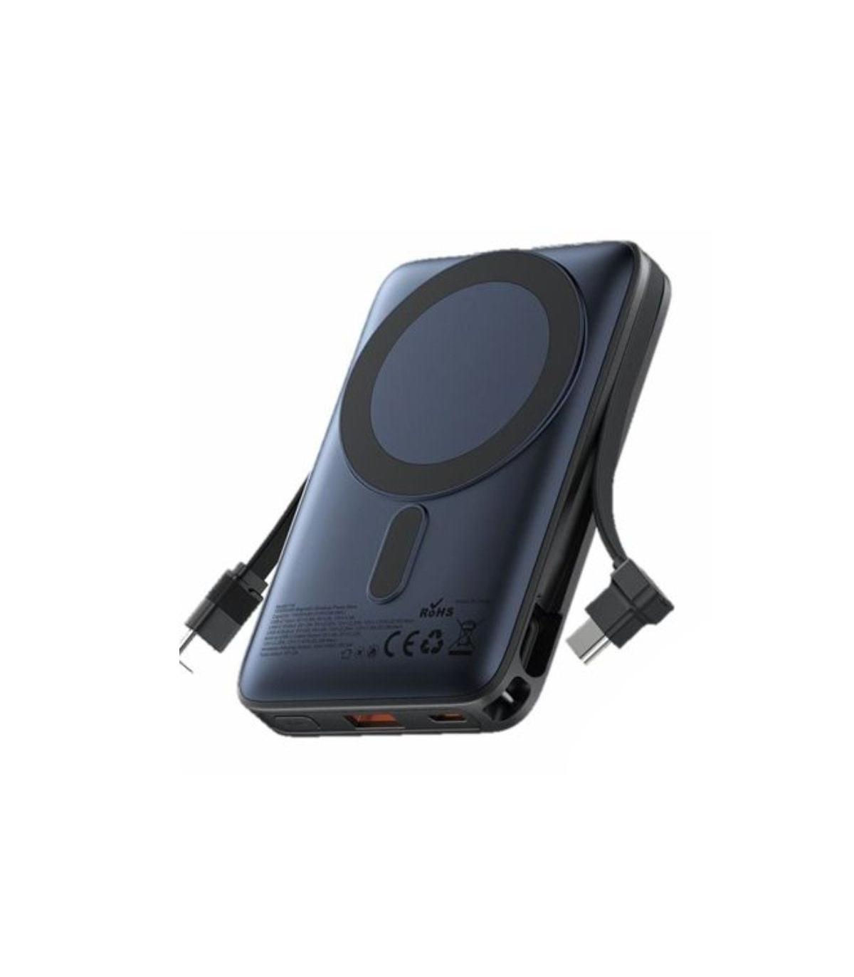 Batera externa magntica de 10,000 mAh (USB-C + USB-C/USB-A/Inalmbrico) con cable incorporado y soporte. Potencia de salida: 22.5 W Pantalla LED blanca Material: ABS con recubrimiento UV Soporte de aleacin de aluminio