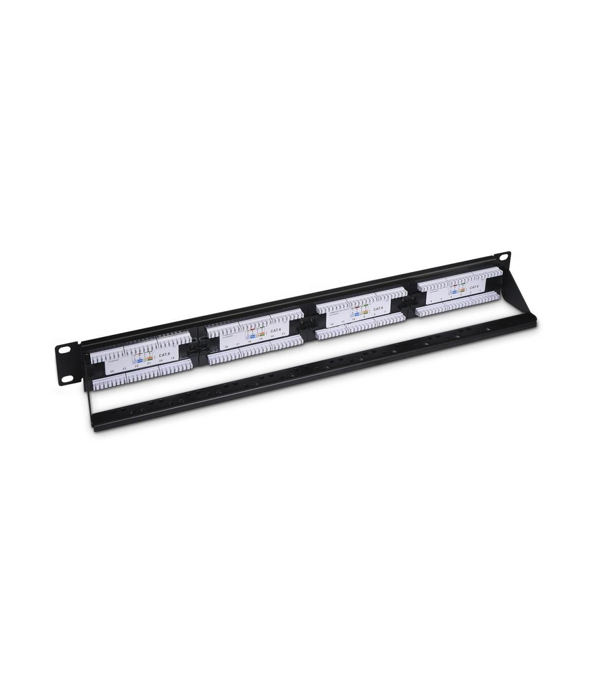 Panel de parcheo de 24 puertos con gestión de cables para conexión RJ45 cat.6 utp.