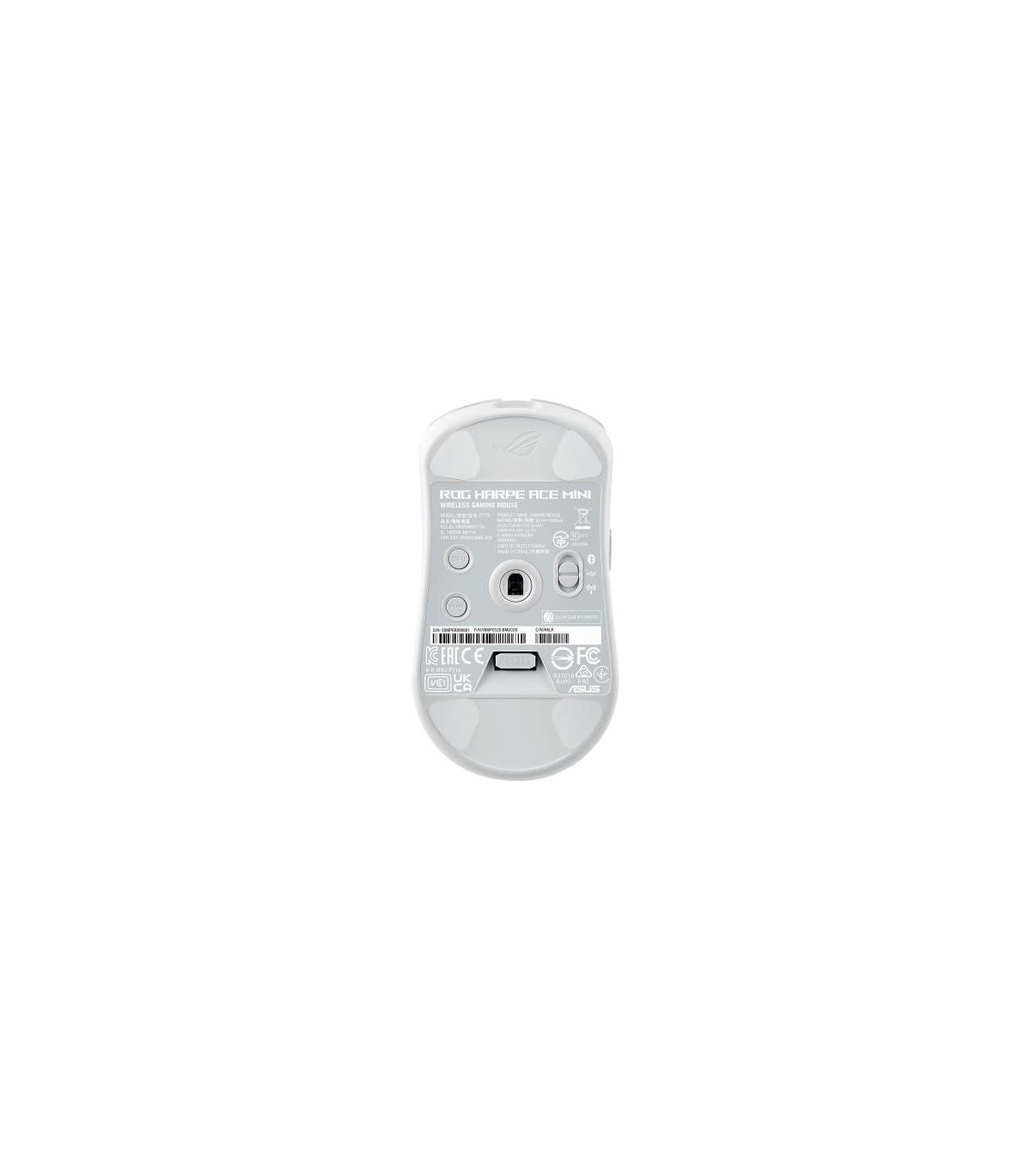 ASUS ROG Harpe Ace Mini. Factor de forma: Ambidextro. Tecnología de detección de movimientos: Óptico, Interfaz del dispositivo: RF Wireless + Bluetooth + USB Type-C, Resolución de movimiento: 42000 DPI, Tipo de desplazamiento: Rueda. Fuente de energía: Baterías/Cable. Color del producto: Blanco