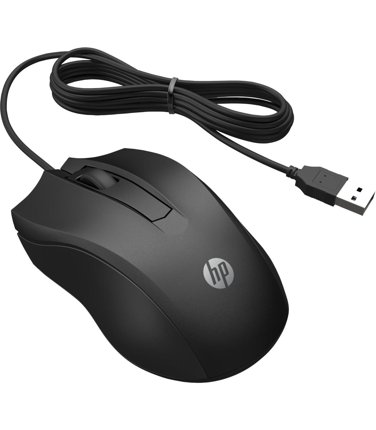 HP Ratón con cable 100. Factor de forma: Ambidextro. Tecnología de detección de movimientos: Óptico, Interfaz del dispositivo: USB tipo A, Resolución de movimiento: 1600 DPI, Tipo de botones: Botones presionados, Cantidad de botones: 3, Tipo de desplazamiento: Rueda. Fuente de energía: Cable. Color del producto: Negro