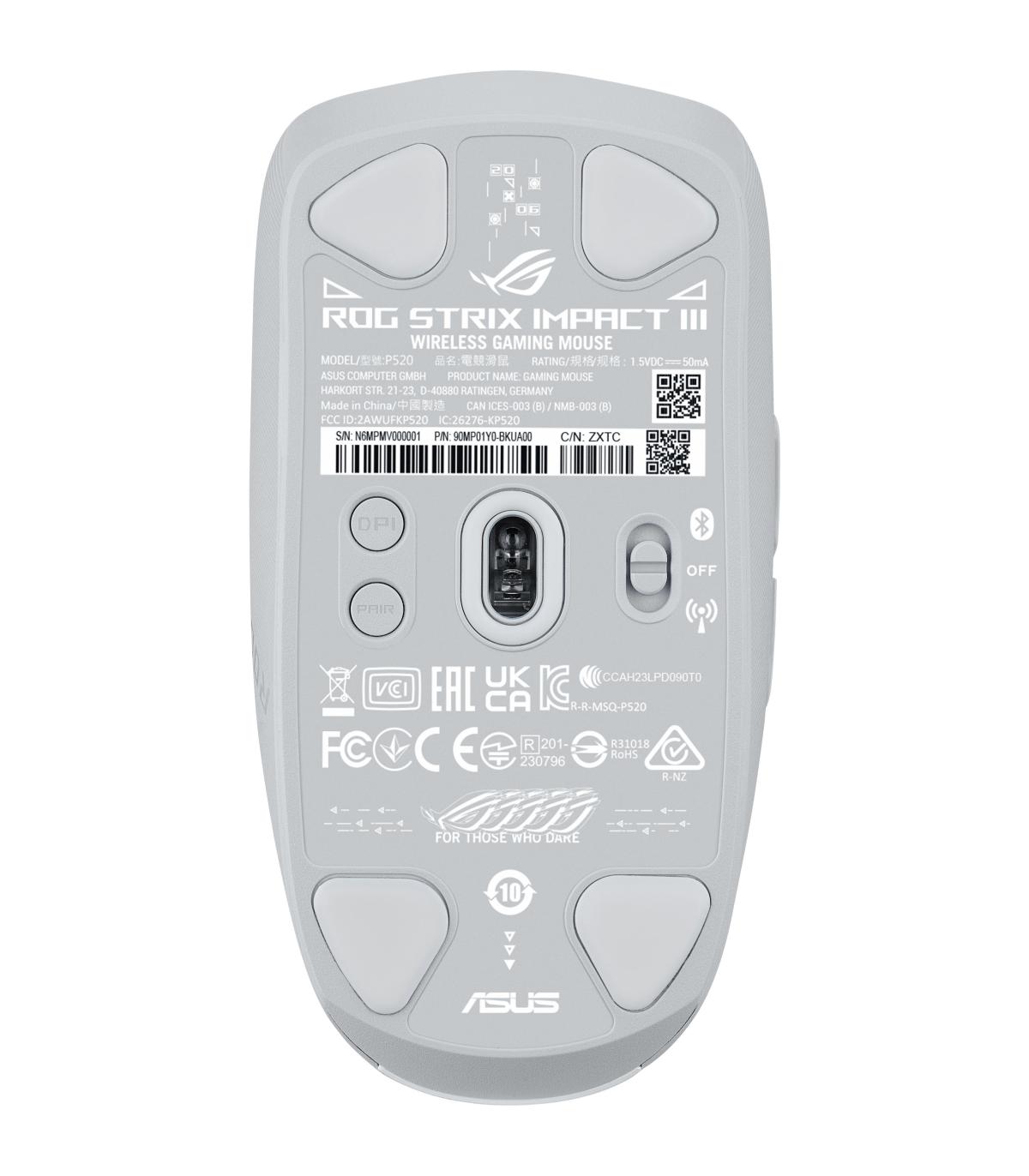 ASUS ROG Strix Impact III Wireless. Factor de forma: Ambidextro. Tecnología de detección de movimientos: Óptico, Interfaz del dispositivo: RF Wireless + Bluetooth, Resolución de movimiento: 36000 DPI, Tipo de desplazamiento: Rueda, Aceleración (máx.): 50 G. Fuente de energía: Baterías. Color del producto: Blanco