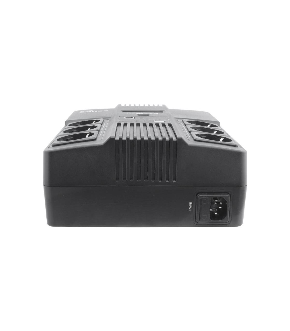 CoolBox SAI SCUDO3 800VA 480W 3+3 SCHUKOS + SOFTWARE. Topología UPS: Línea interactiva, Capacidad de potencia de salida (VA): 0,8 kVA, Potencia de salida: 480 W. Tipo de salida AC: Tipo F, Cantidad de salidas AC: 6 salidas AC, Tipo de puerto USB: USB Type-A/USB Type-B. Capacidad de la batería: 7 Ah, Voltaje de la pila: 12 V, Tiempo de recarga (90%): 8 h. Factor de forma: Compacto, Color del producto: Negro, Tipo de visualizador: LCD. Cables incluidos: Cable de alimentación de entrada, Cable USB