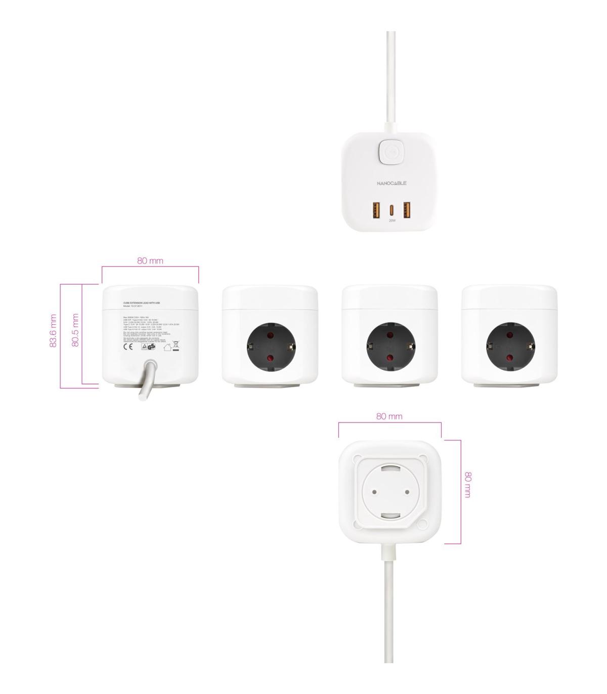 Regleta compacta en formato cubo con 3 enchufes de 16A y 3 puertos USB (2x USB-A + 1x USB-C). Incluye base de sujeción y cinta adhesiva 3M para montaje en pared o escritorio.