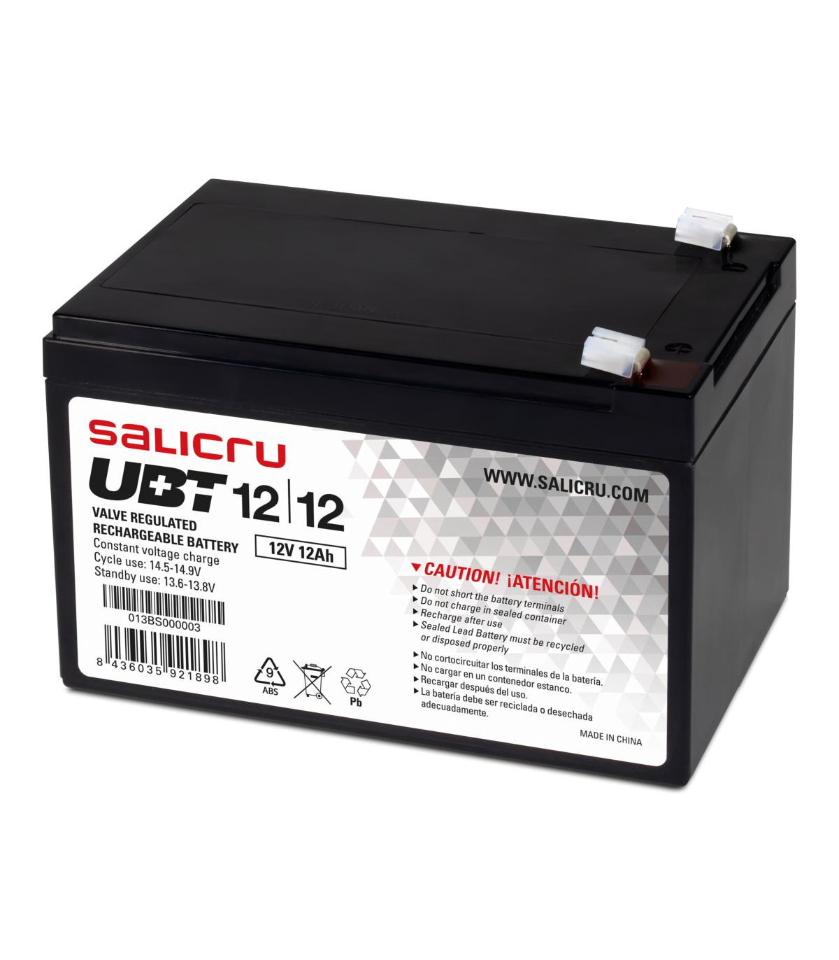 Salicru UBT 12/12. Tecnología de batería: Sealed Lead Acid (VRLA), Voltaje de la pila: 12 V, Capacidad de la batería: 12 Ah. Certificación: CE, WEEE. Peso: 3,4 kg, Ancho: 151 mm, Altura: 95 mm
