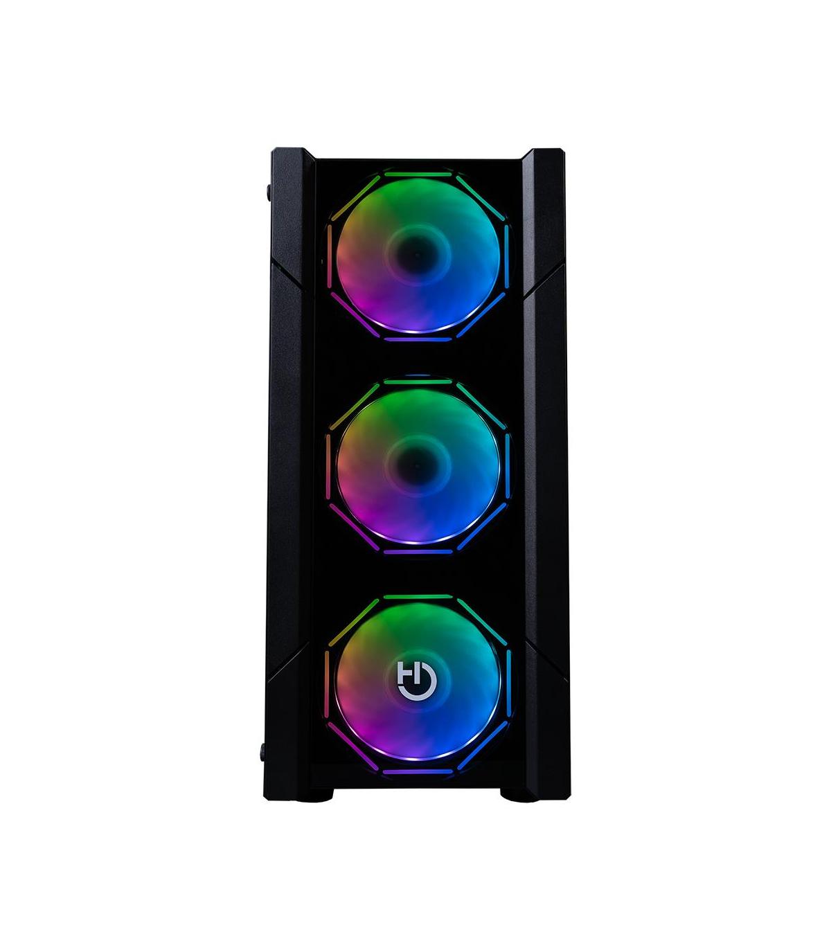 Hiditec V30 ARGB. Tipo: PC, Color del producto: Negro, Formas de factor de tarjeta madre soportadas: ATX, ITX, micro ATX. Ventiladores frontales instalados: 3x 120 mm, Diámetro de ventiladores frontales soportados: 120 mm, Ventiladores traseros instalados: 1x 120 mm. Ancho: 190 mm, Profundidad: 335 mm, Altura: 428 mm. Grosor del panel de vidrio templado: 4 mm