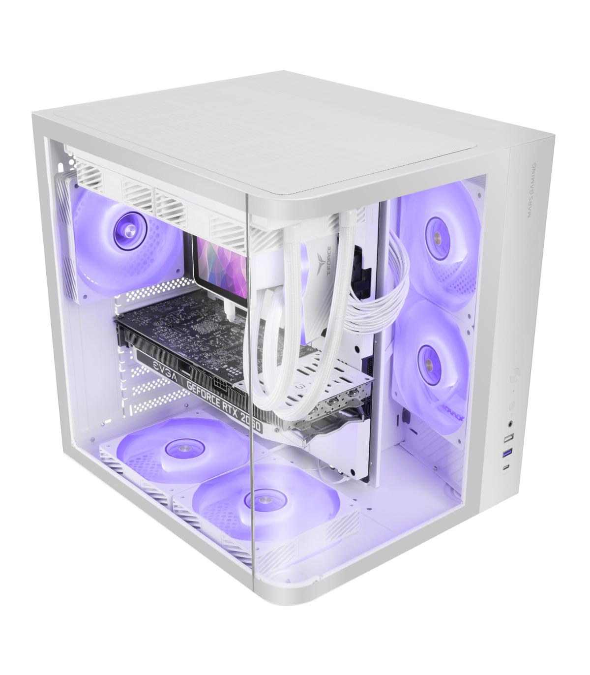 Mars Gaming MC-CURVW. Factor de forma: Midi Tower, Tipo: PC, Color del producto: Negro, Blanco. Factores de forma de la fuente de alimentación compatibles: ATX. Diámetro de ventiladores secundarios soportados: 120 mm, Diámetro de ventiladores traseros soportados: 120 mm, Diámetros de ventiladores superiores soportados: 120,140 mm. Tamaños de disco duro soportados: 2.5,3.5". Ancho: 286 mm, Profundidad: 343 mm, Altura: 353 mm