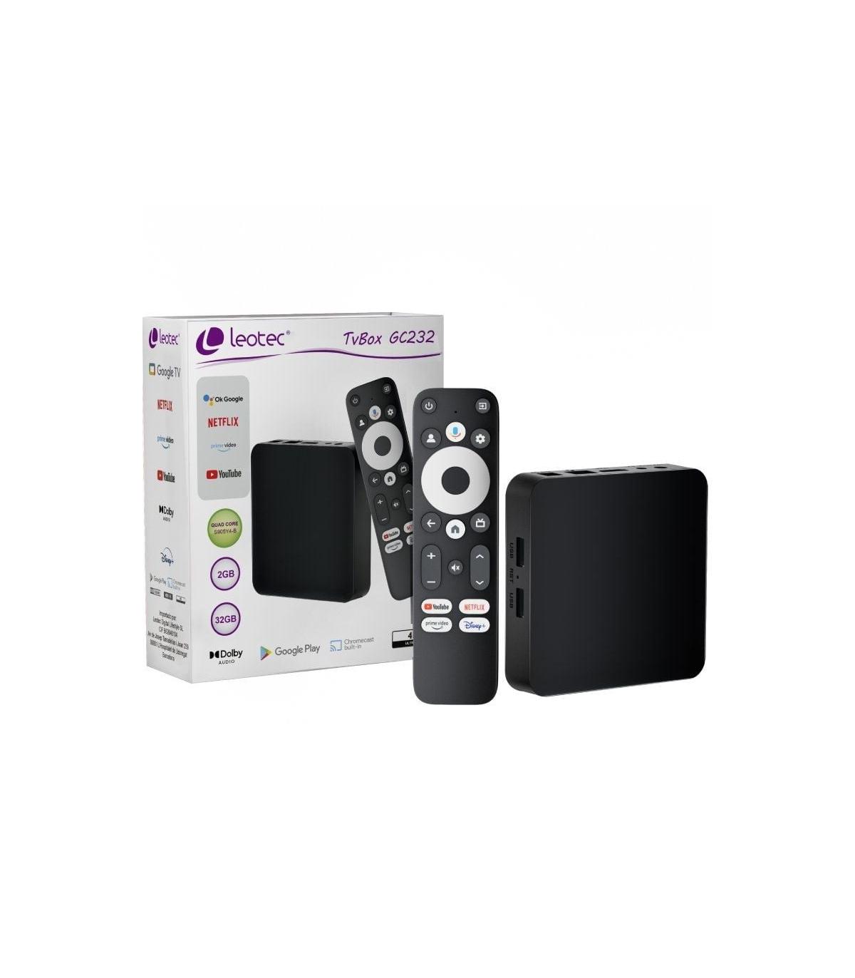 Disfruta de una experiencia multimedia nica en tu televisor con la mejor calidad de imagen y sonido gracias al nuevo Google Tv Box GC232 de Leotec. Simplemente scalo de la caja, conctalo a tu televisor mediante el cable HDMI que incorpora y mediante el uso de su mando a distancia bluetooth con sistema de reconocimiento por voz, entra en una nueva dimensin en cuanto a reproduccin de contenidos y aplicaciones en Tv.