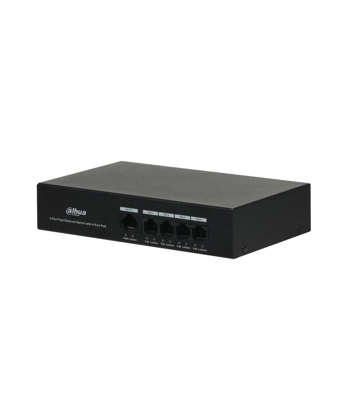 Dahua Technology PoE DH-PFS3005-4ET-36. Tipo de interruptor: No administrado, Capa del interruptor: L2. Puertos tipo básico de conmutación RJ-45 Ethernet: Fast Ethernet (10/100), Cantidad de puertos básicos de conmutación RJ-45 Ethernet: 5. Tabla de direcciones MAC: 1000 entradas, Capacidad de conmutación: 1 Gbit/s. Estándares de red: IEEE 802.3, IEEE 802.3af, IEEE 802.3at, IEEE 802.3u, IEEE 802.3x. Conector eléctrico: Conector de alimentación AC-in. Energía sobre Ethernet (PoE)