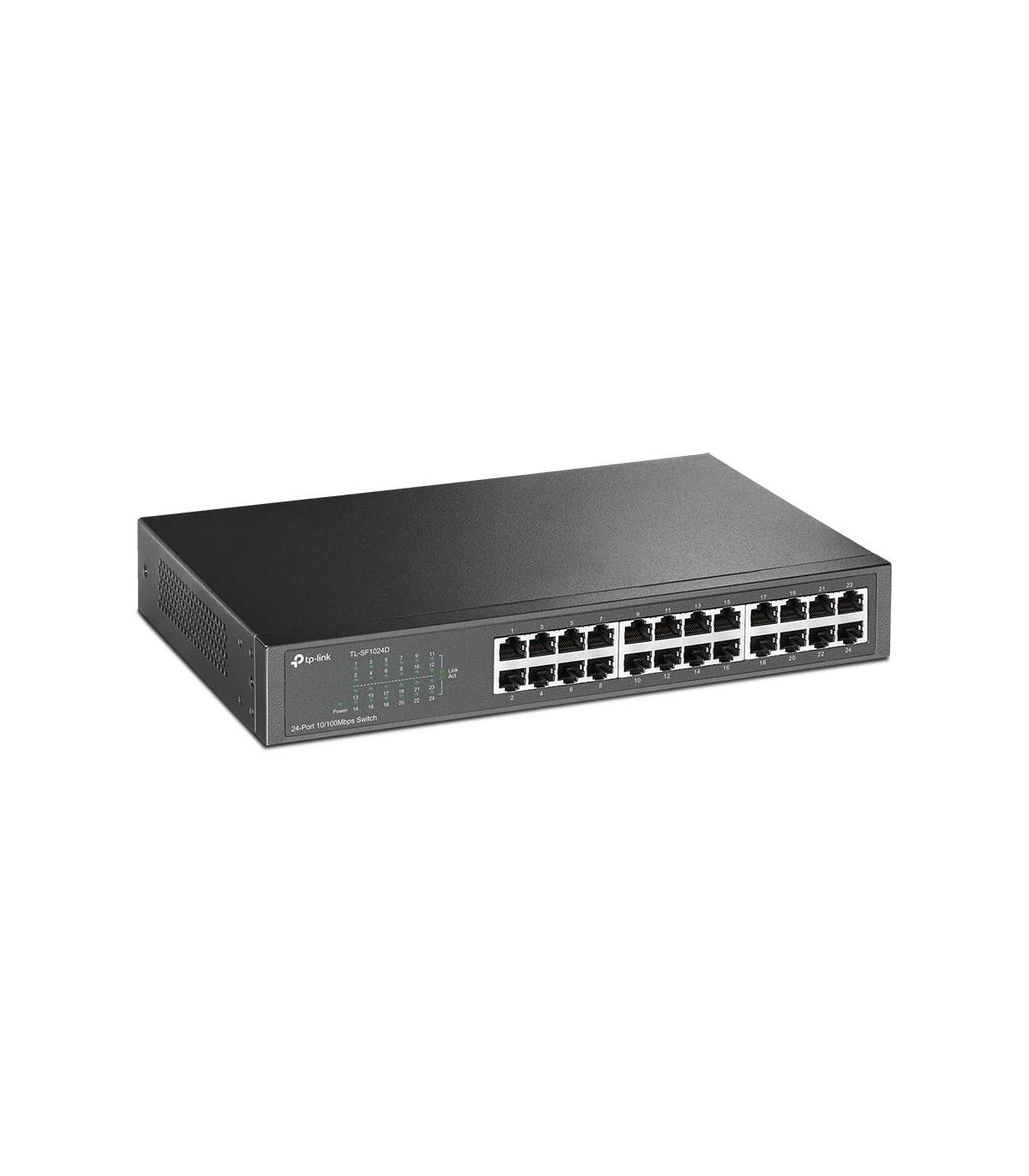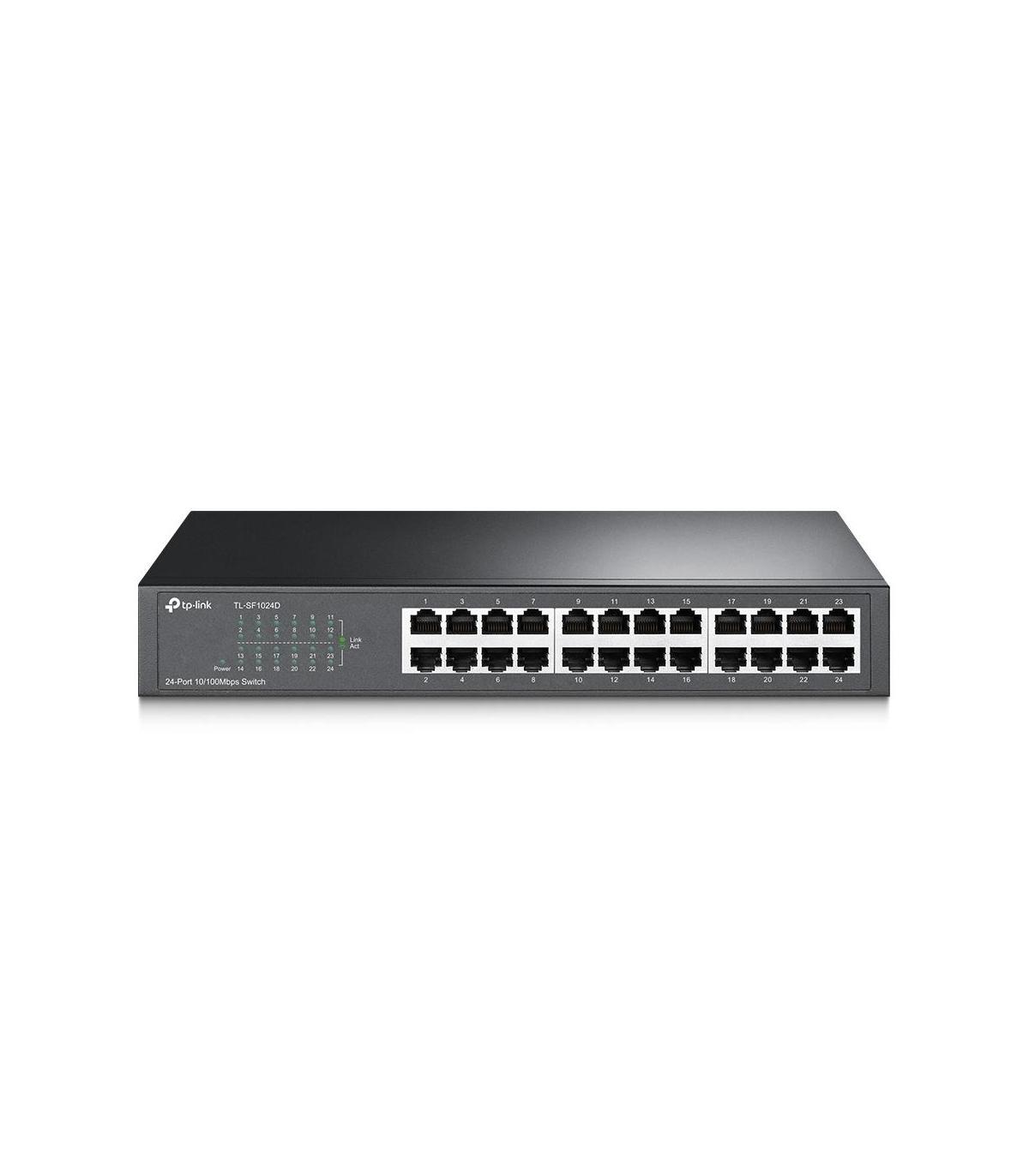 TP-Link TL-SF1024D. Tipo de interruptor: No administrado. Puertos tipo básico de conmutación RJ-45 Ethernet: Fast Ethernet (10/100), Cantidad de puertos básicos de conmutación RJ-45 Ethernet: 24. Tabla de direcciones MAC: 8000 entradas, Capacidad de conmutación: 4,8 Gbit/s. Estándares de red: IEEE 802.3i, IEEE 802.3u, IEEE 802.3x. Conector eléctrico: Conector de alimentación AC-in. Montaje en rack